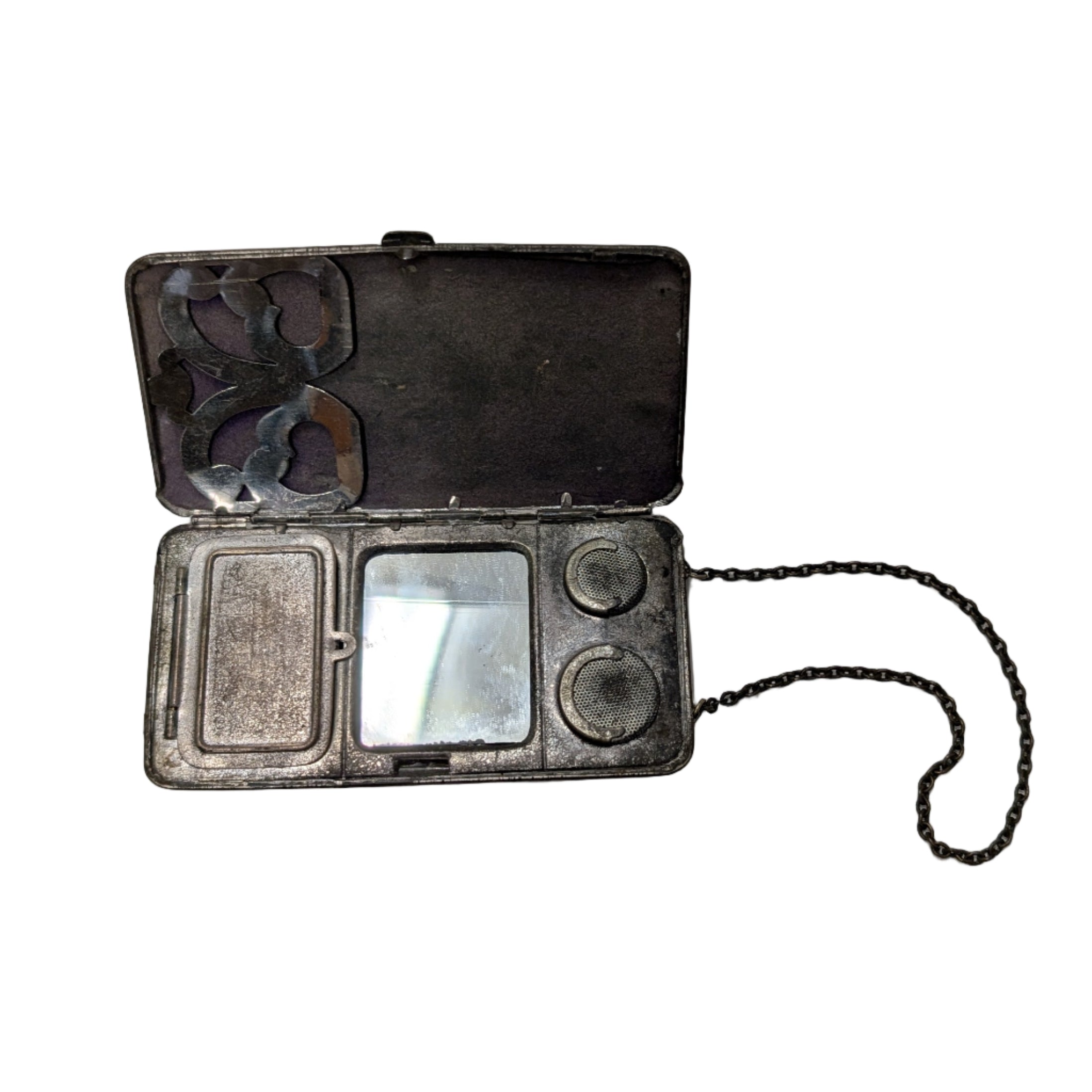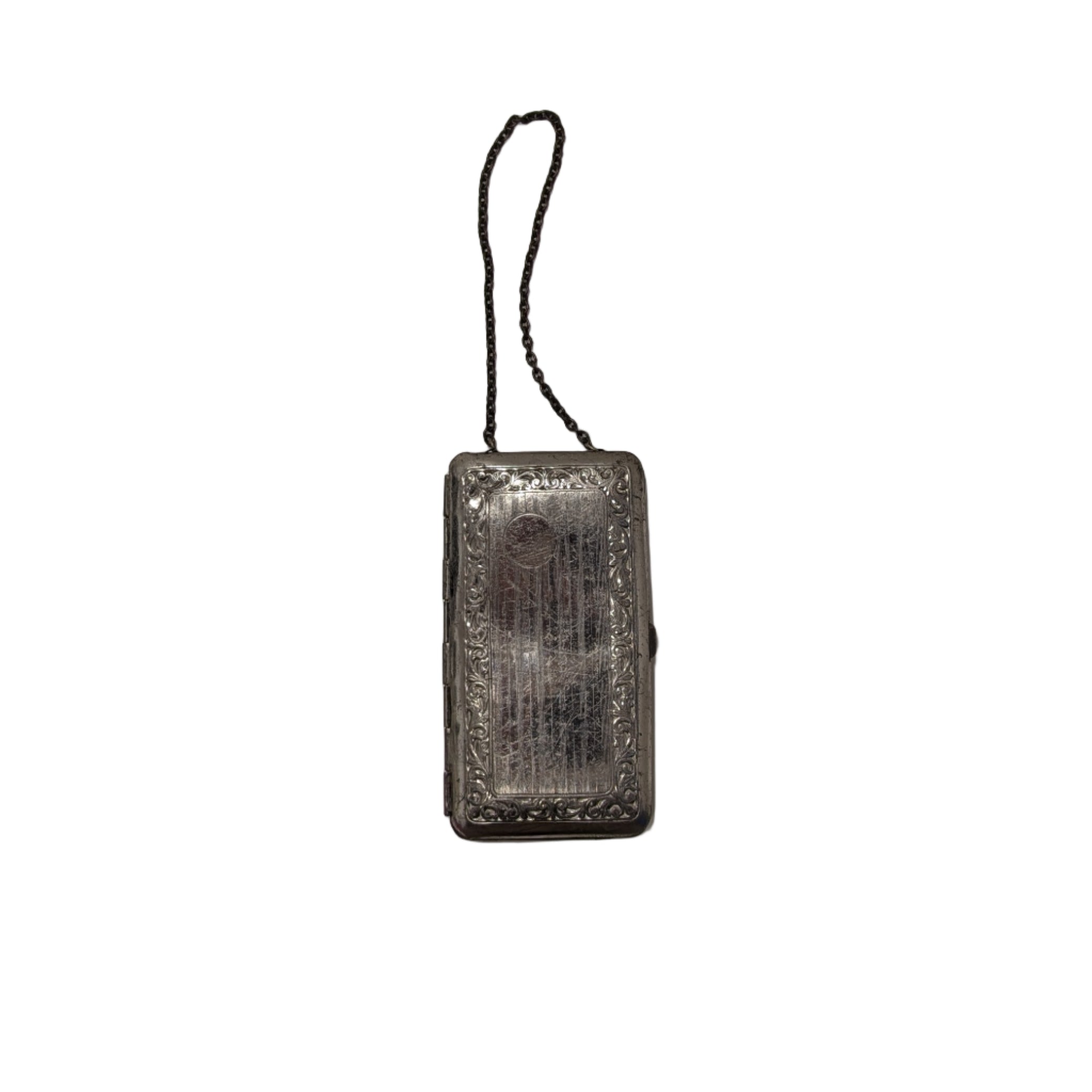 This charming antique silver-coloured coin purse is a beautiful example of vintage craftsmanship and functional design. Perfect for collectors of vintage accessories or those who appreciate the elegance of bygone eras.