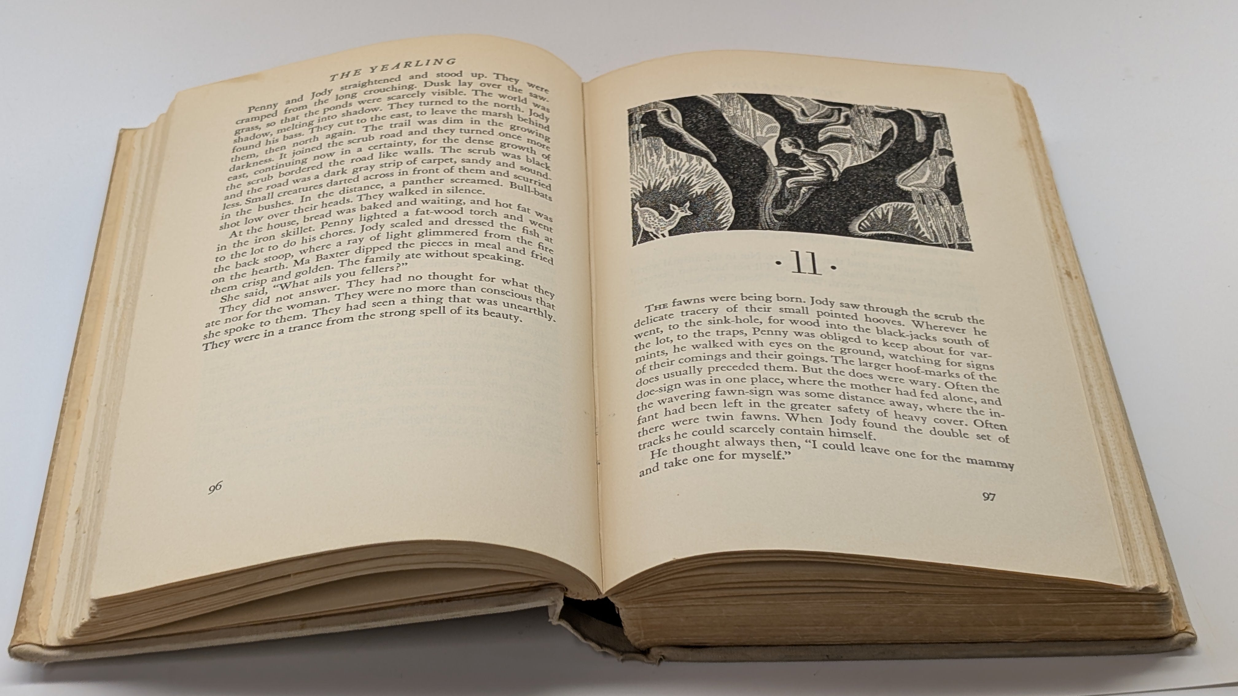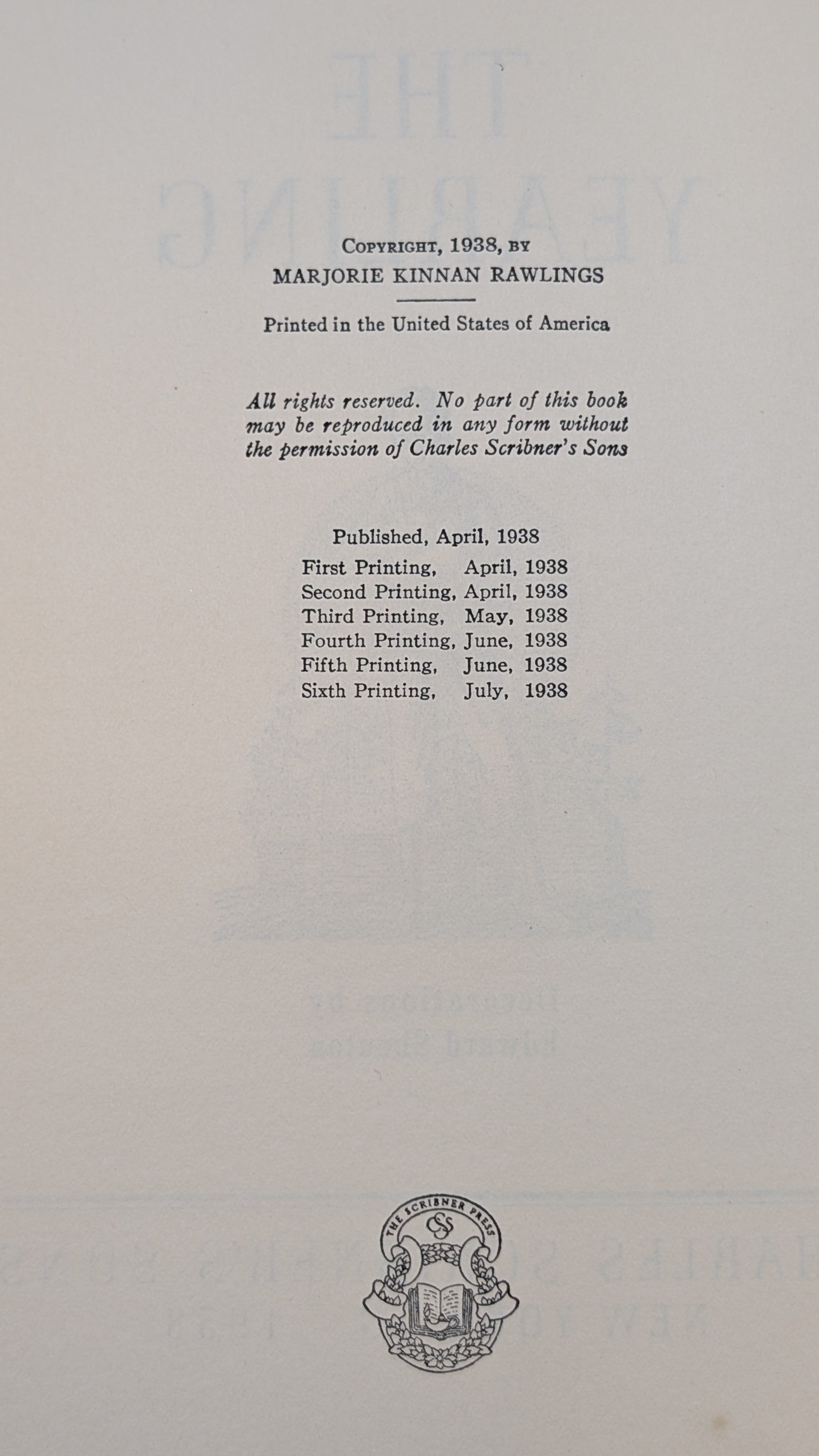 Step into the timeless world of Marjorie Kinnan Rawlings' Pulitzer Prize-winning novel, 'The Yearling'. This sixth printing from July 1938 is a rare gem for book collectors. Despite some writing inside the front cover and discoloration on the outside, this hardcover edition remains in fair to good condition. Immerse yourself in the captivating story of a young boy's journey in the Florida backwoods, as he learns valuable lessons about life, love, and loss. Feel the worn pages between your fingers and experience the joy of reading a piece of literary history.