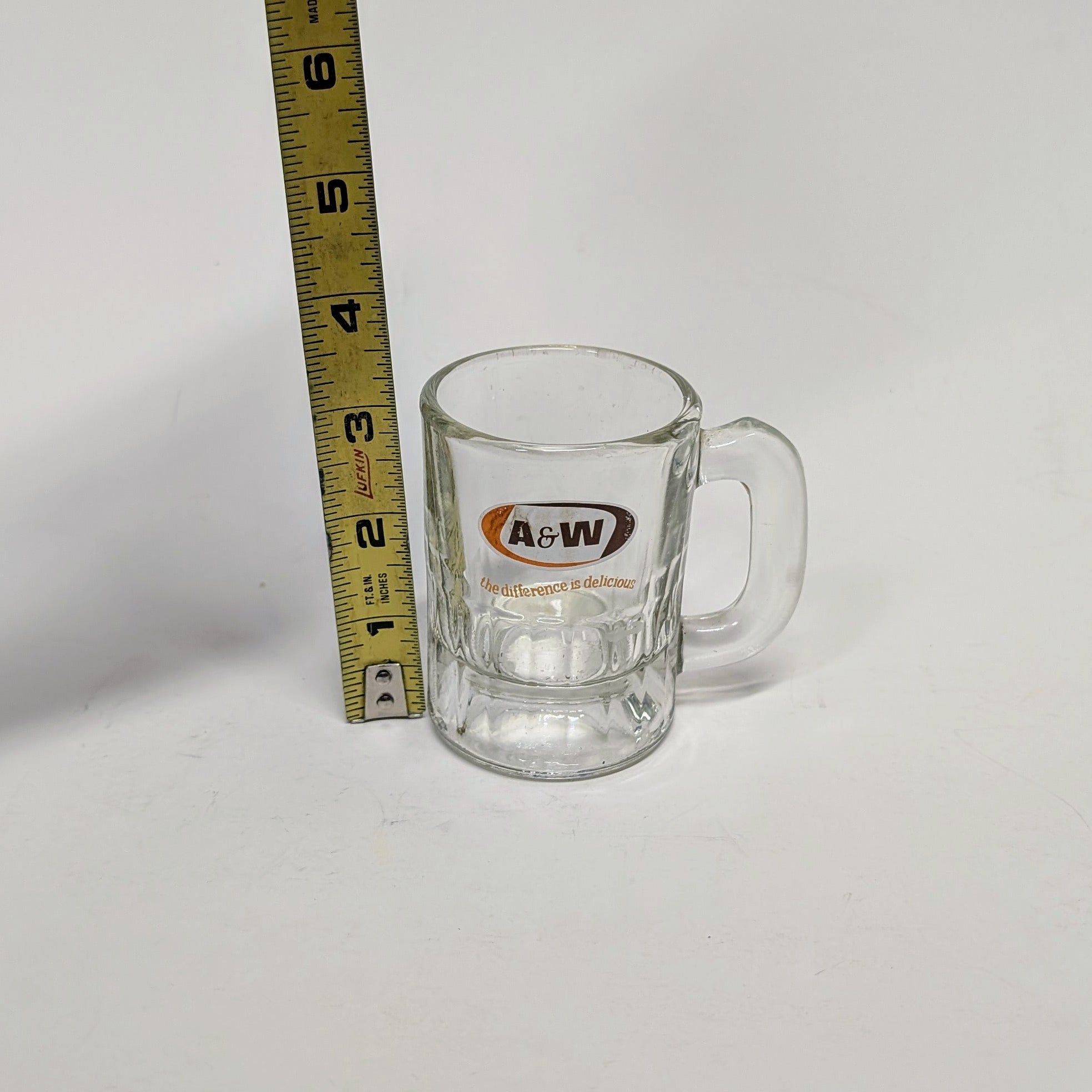 This small vintage A&W glass mug is perfect for enjoying your favorite cold beverage. Made with sturdy glass and a classic design, it's both functional and stylish. With a perfect size for a single serving, it's great for adding a touch of nostalgia to your drinkware collection.