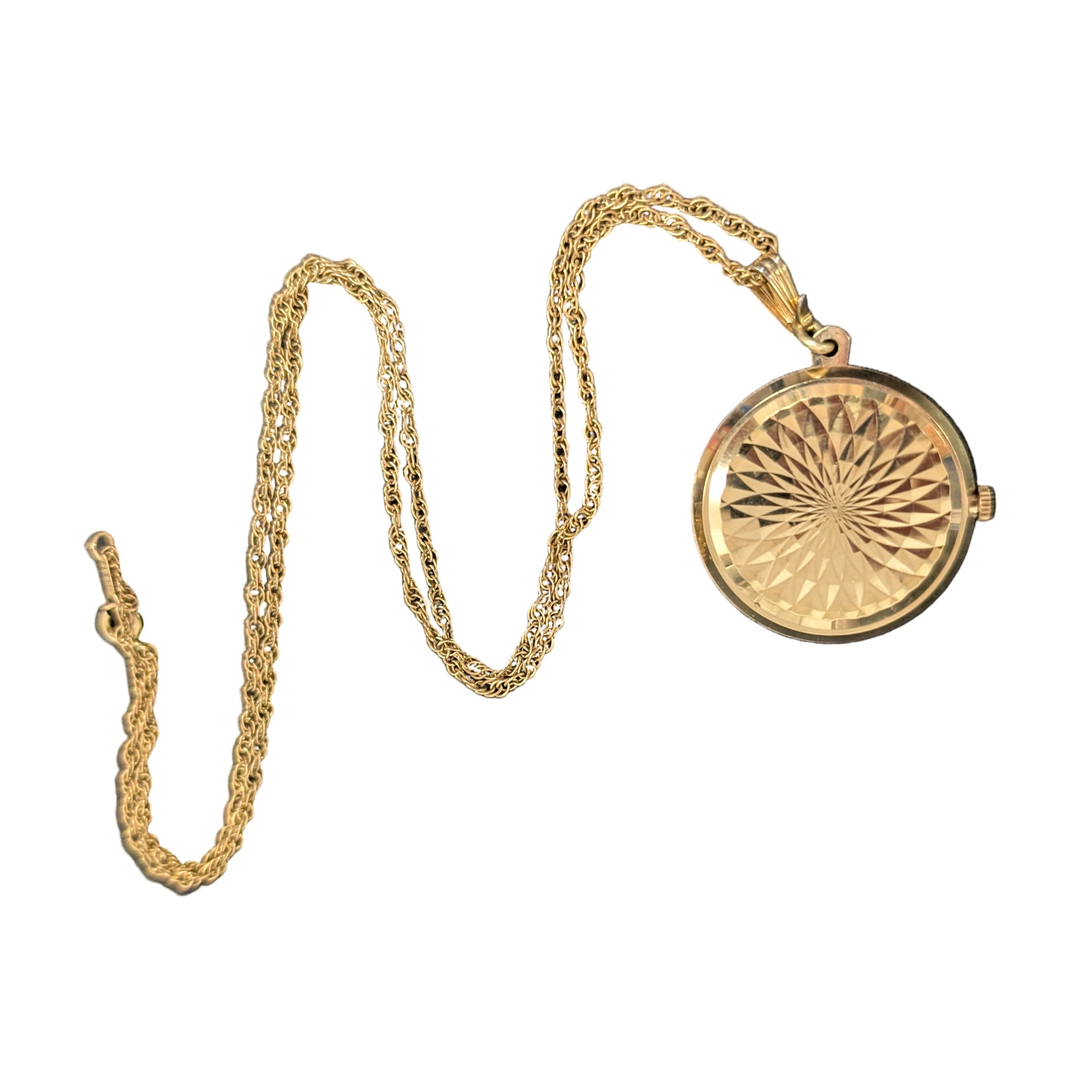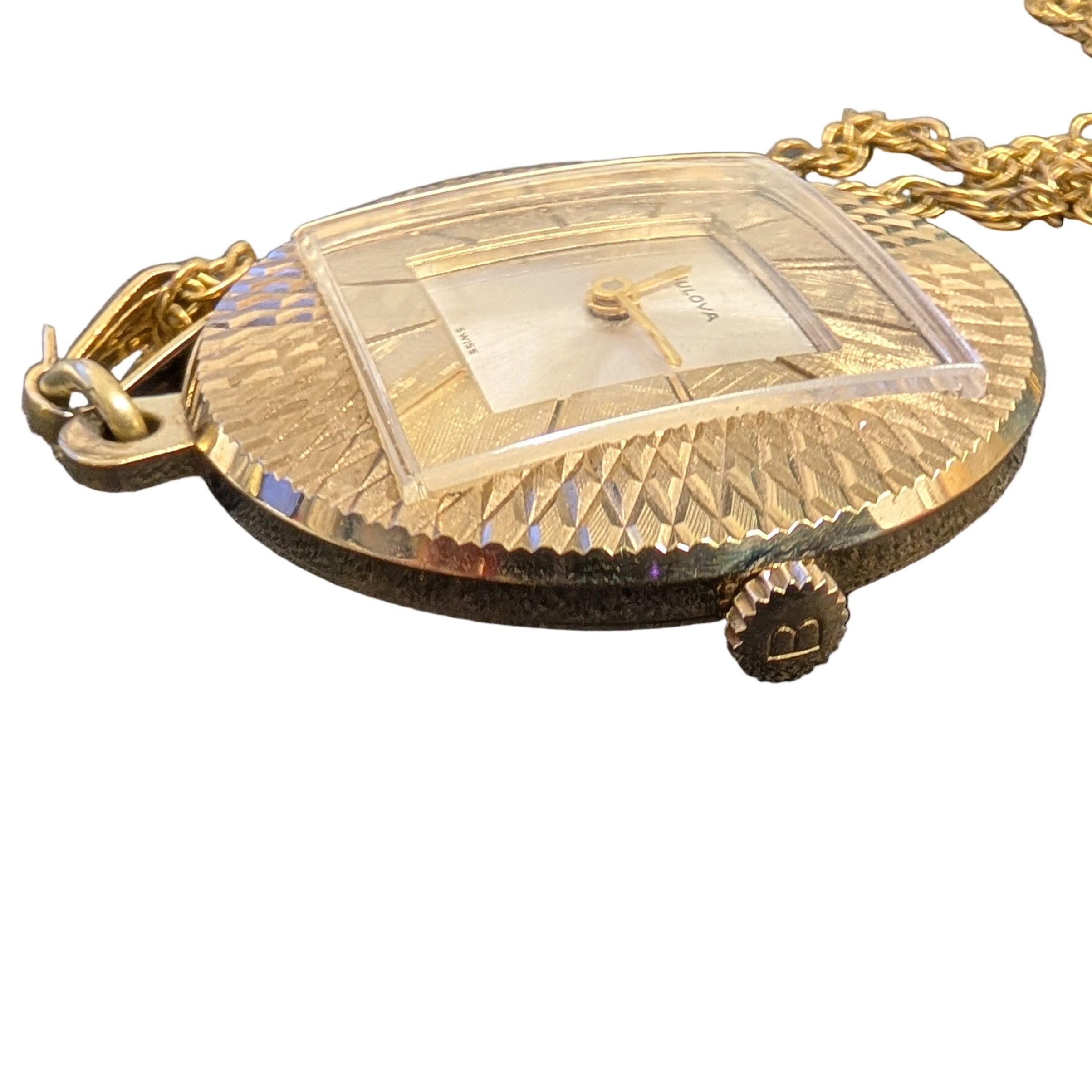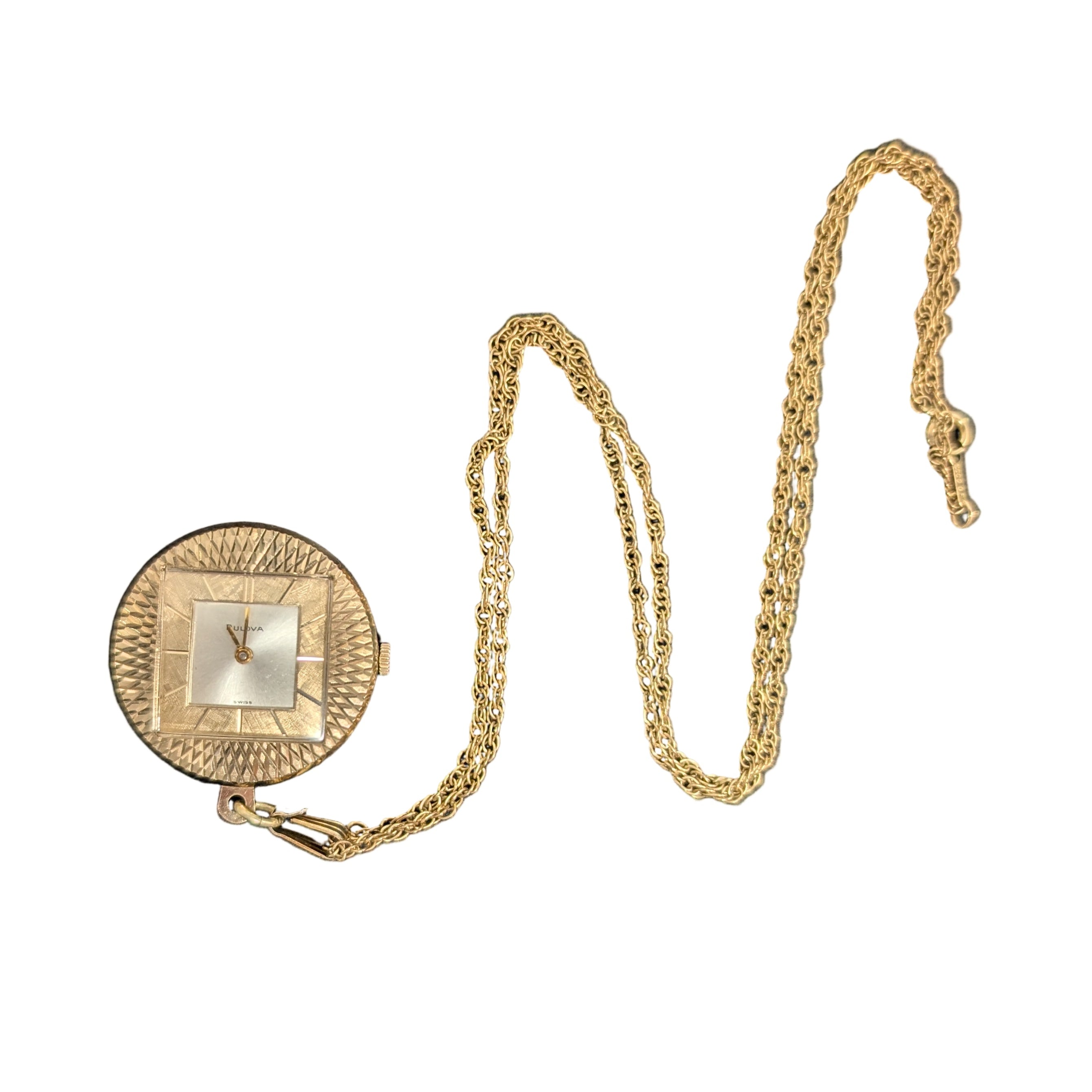 Vintage round Bulova Wind-Up Pendant Watch with a square face, in working condition, 35mm diameter, on a 24" twisted rope chain, stamped "ECCO GF". Watch still has the original Bulova crown (see photos), in excellent condition.