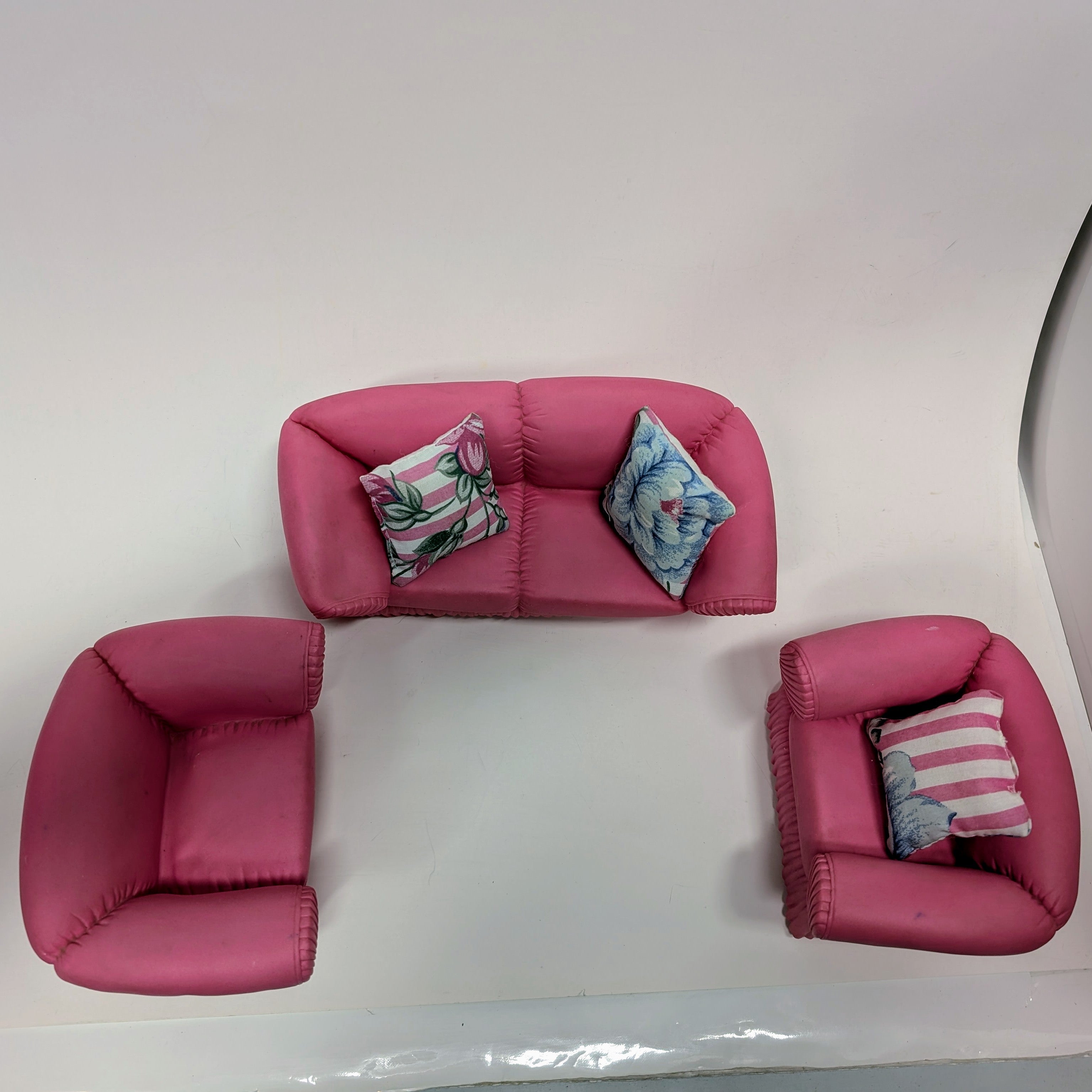 Relive the iconic style of the 1990s with this complete Barbie Beverly Hills Family Room set, a true vintage treasure! This coveted set includes two plush armchairs, a matching sofa, three vibrant cushions, and the original box – a rare find for serious collectors.