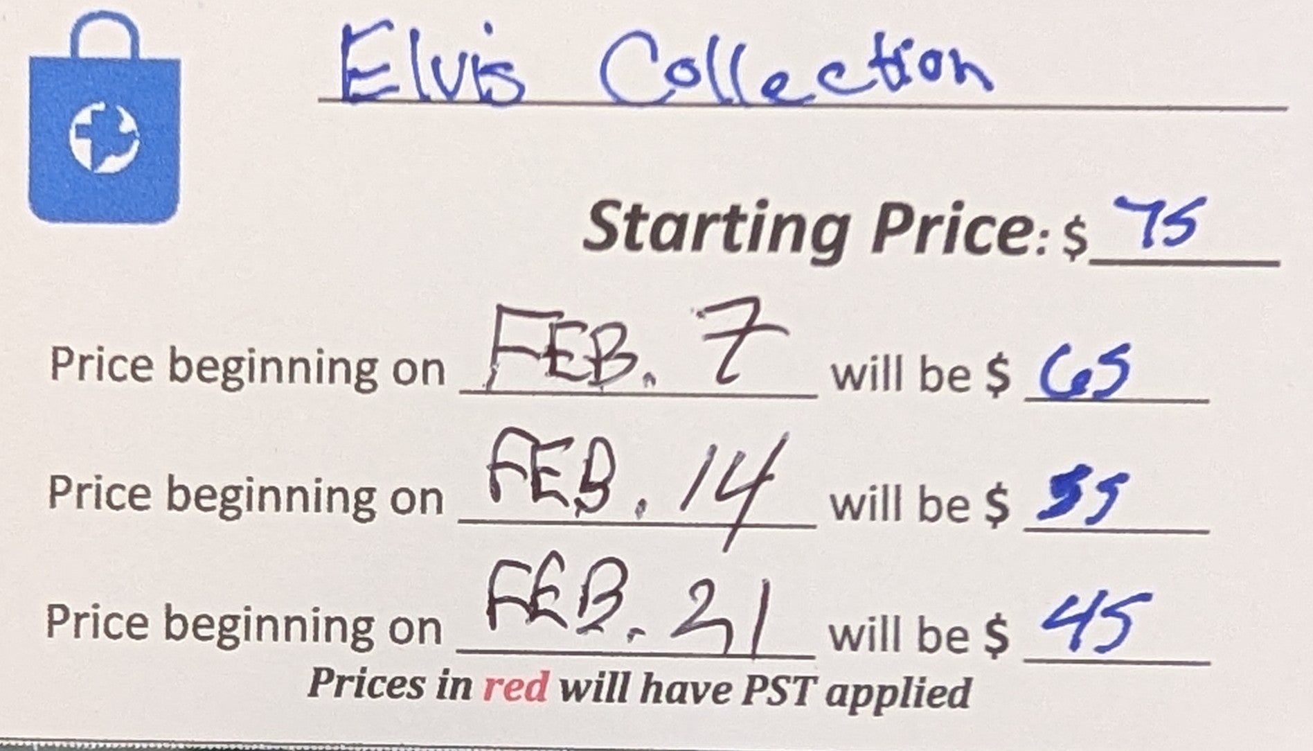 Part of our "Countdown Auction", this item is available for immediate purchase. The price is set to drop every Saturday morning (by 9:30 in store & online); see the picture of the description card for amounts and dates. (Please note, items priced over $100 will have 7% PST applied.)