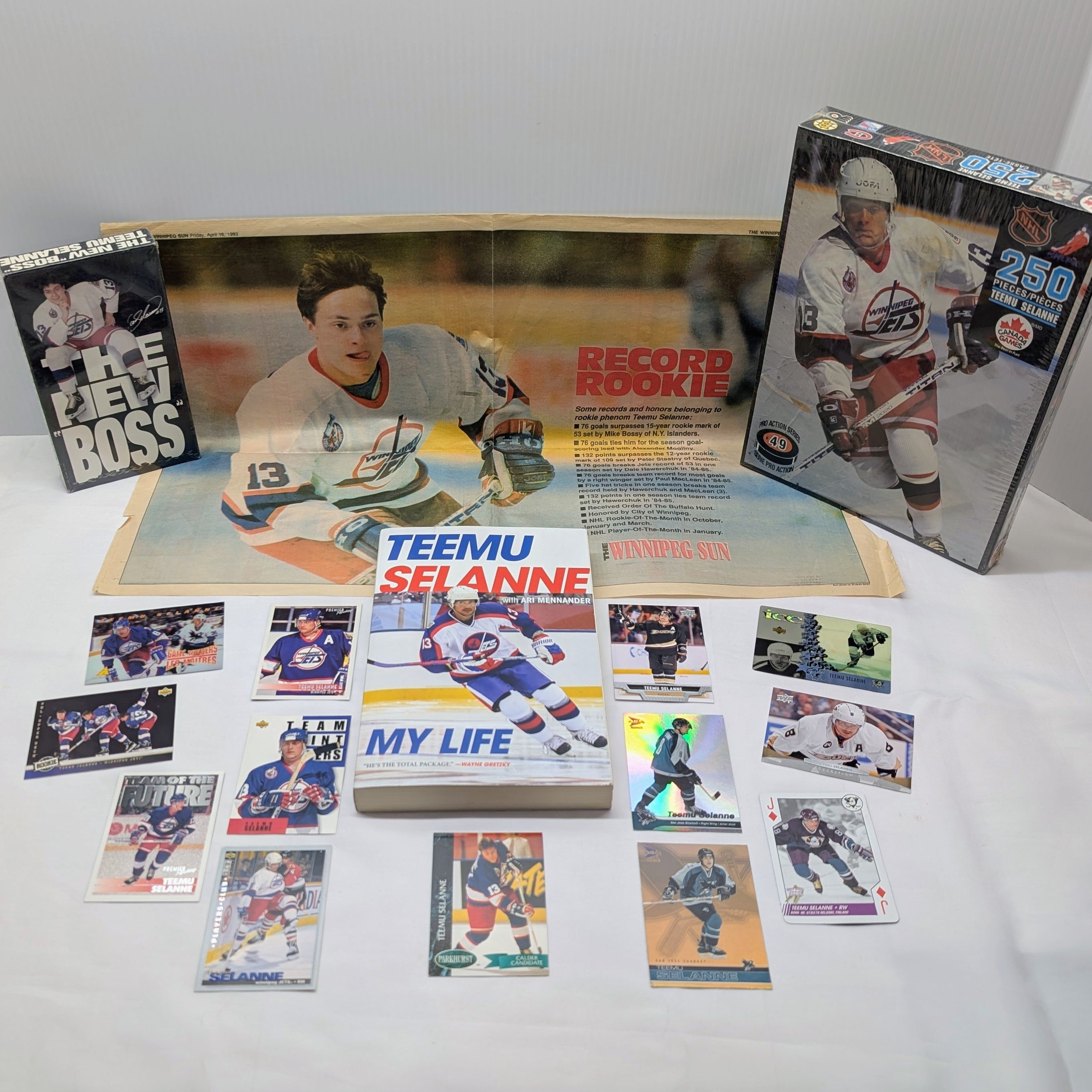 Own a piece of hockey history with this exceptional Teemu Selänne memorabilia collection from 1993 on. This curated bundle celebrates the legendary "Finnish Flash" and his unforgettable debut season with the Winnipeg Jets and his stellar NHL career.