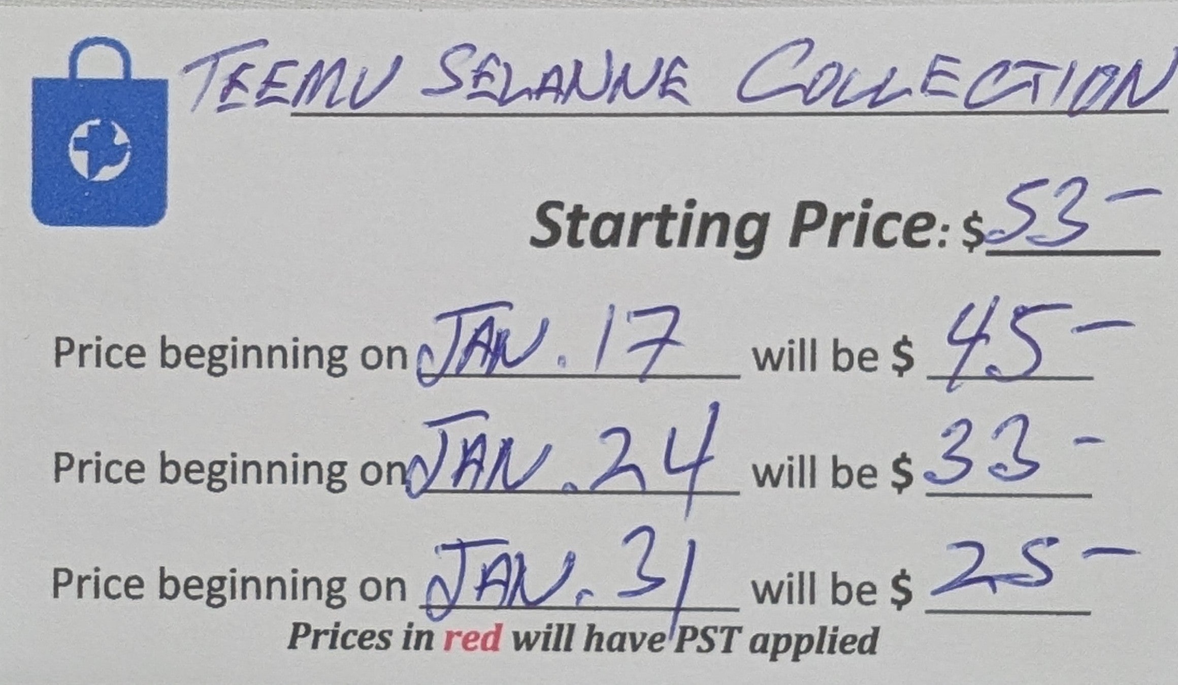Part of our "Countdown Auction", this item is available for immediate purchase. The price is set to drop every Saturday morning (by 9:30 in store & online); see the picture of the description card for amounts and dates. (Please note, items priced over $100 will have 7% PST applied.)