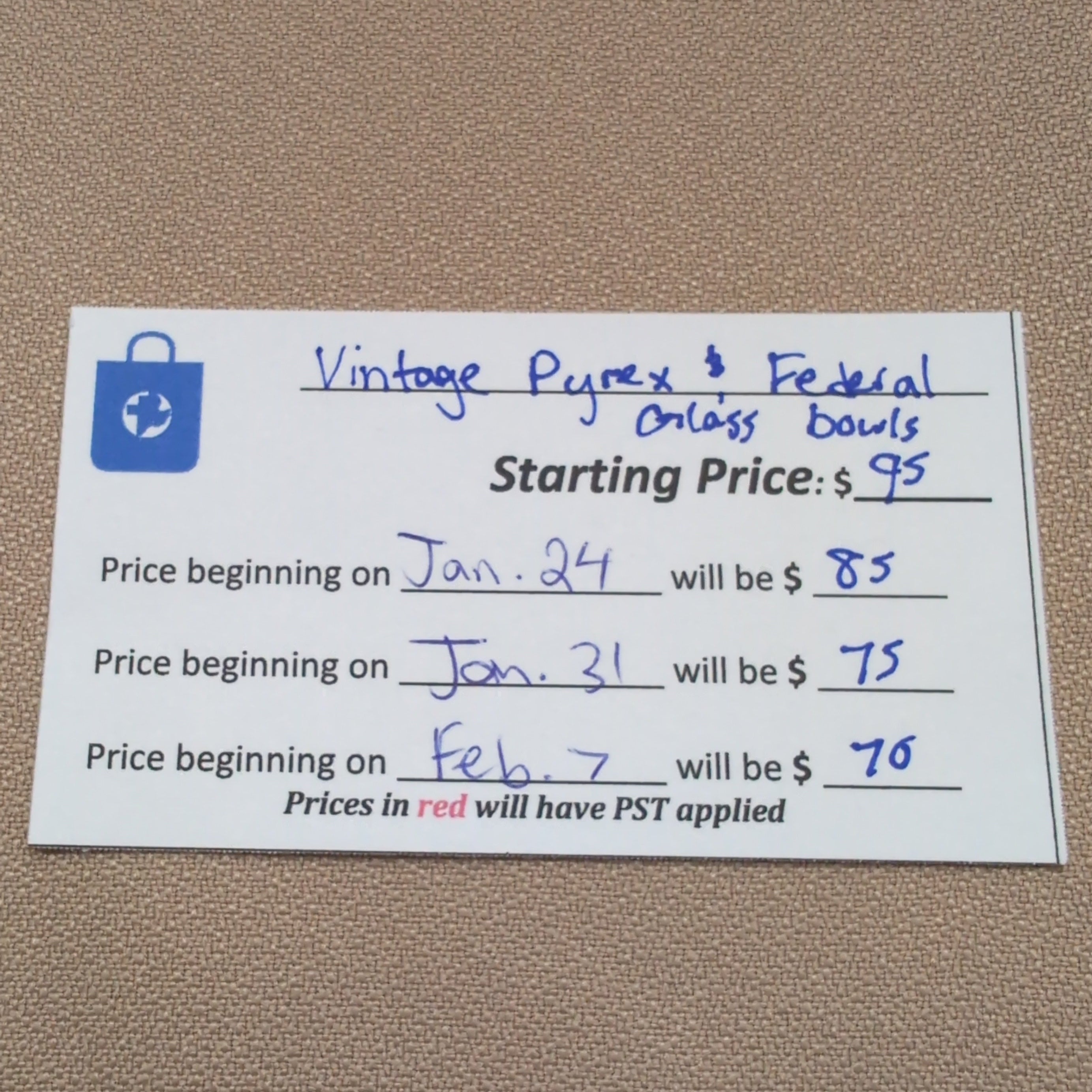 Part of our "Countdown Auction", this item is available for immediate purchase. The price is set to drop every Saturday morning (by 9:30 in store & online); see the picture of the description card for amounts and dates. (Please note, items priced over $100 will have 7% PST applied.)