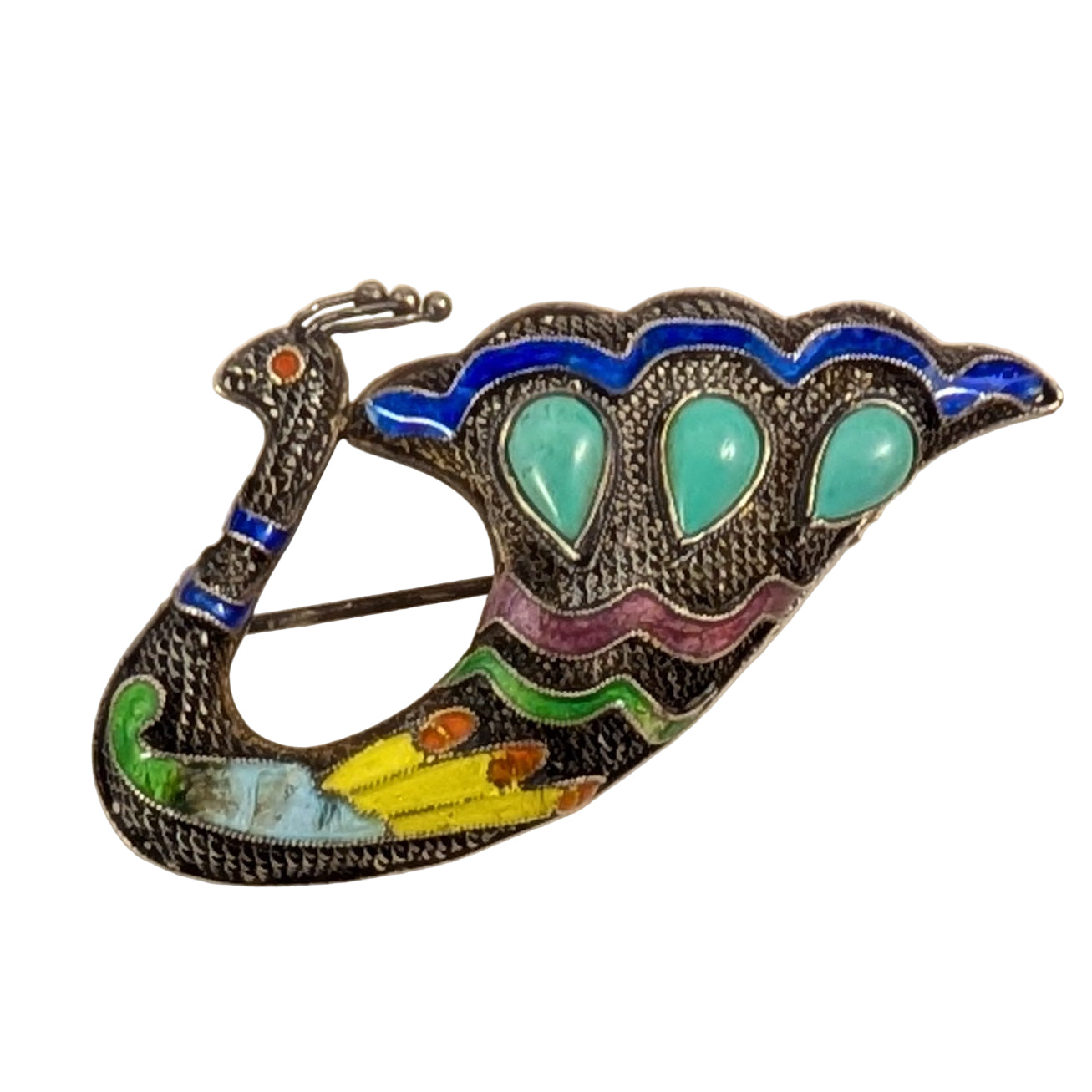 Vintage Silver Peacock Brooch with enamel accents and 3 teardrop shape turquoise colour cabochons. In good condition. Stamped 'silver'.