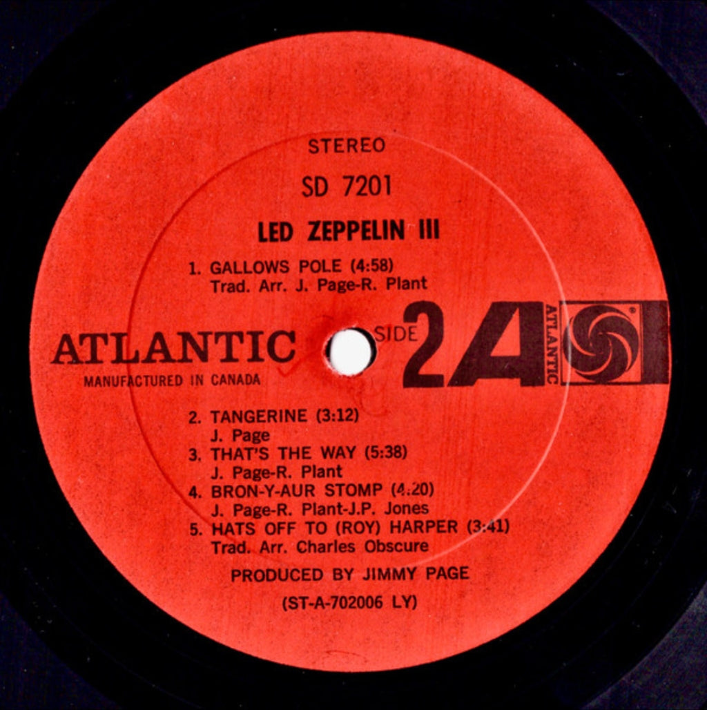 Record label of Led Zeppelin III album with tracklist and Atlantic Records branding.