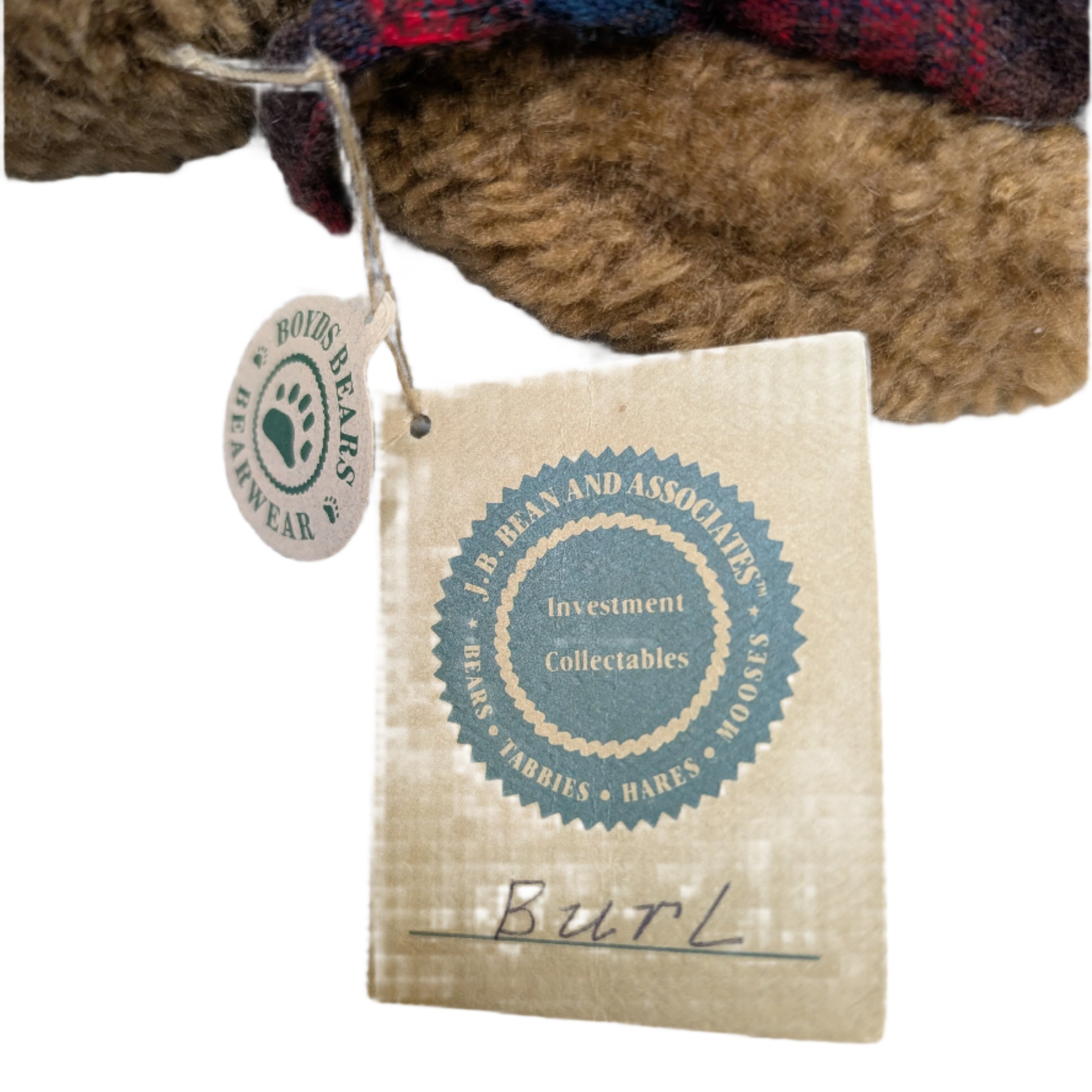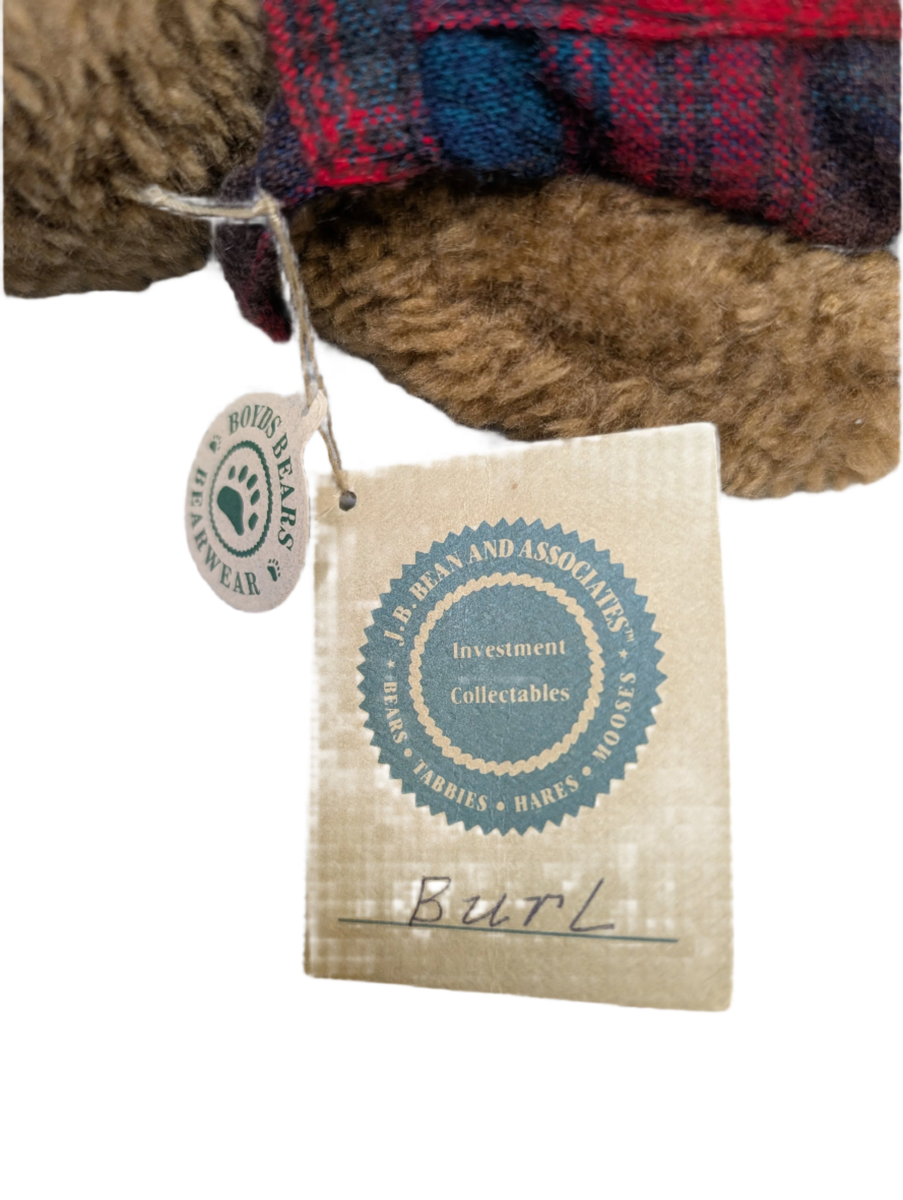 Introducing BURL from Boyds Bears Collectables. This adorable collectible bear is dressed in stylish red and black plaid overalls. Its vintage charm and high-quality craftsmanship make it a must-have for collectors and bear enthusiasts alike.
