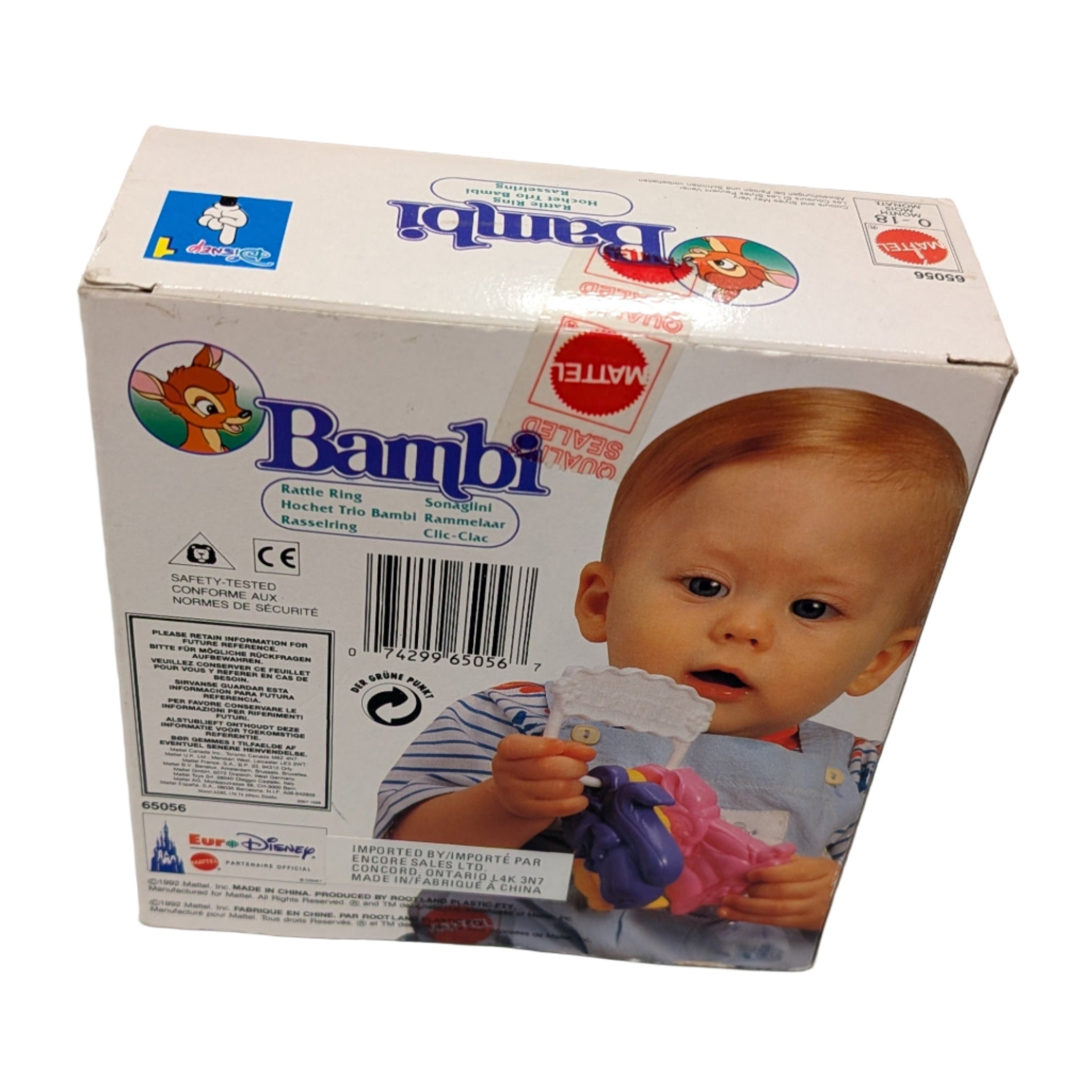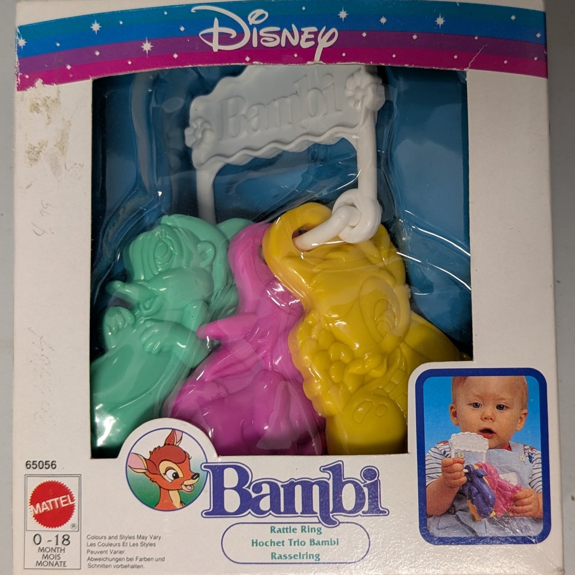 Rare vintage Disney Mattel diamond ring rattle featuring beloved Bambi from 1990s. This collectible baby toy showcases the classic Disney character in a charming diamond-shaped ring design. Perfect for Disney collectors, vintage toy enthusiasts, or as a unique gift for Bambi fans. Box still intact, has some damage on the front.