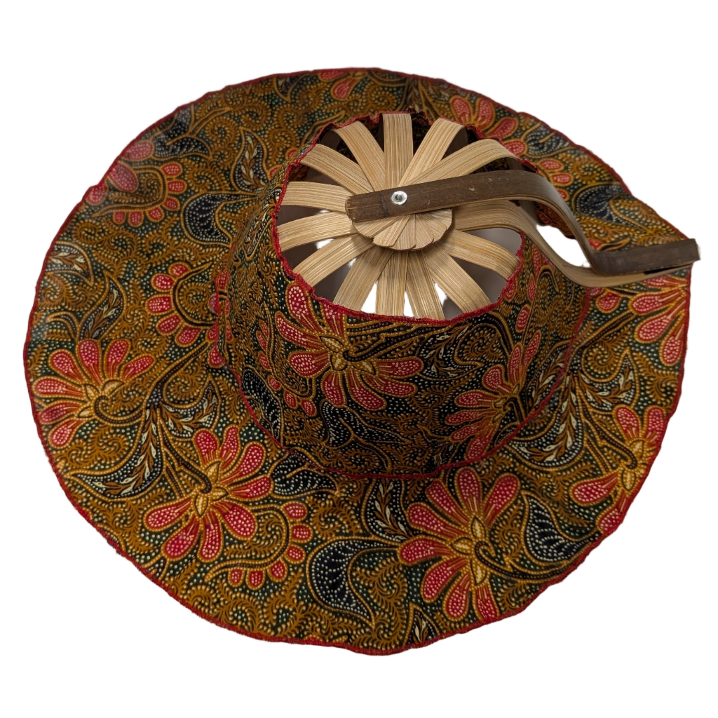 Discover a piece of functional folk art with this authentic vintage bamboo and fabric folding fan hat, combining traditional Asian craftsmanship with ingenious collapsible design.