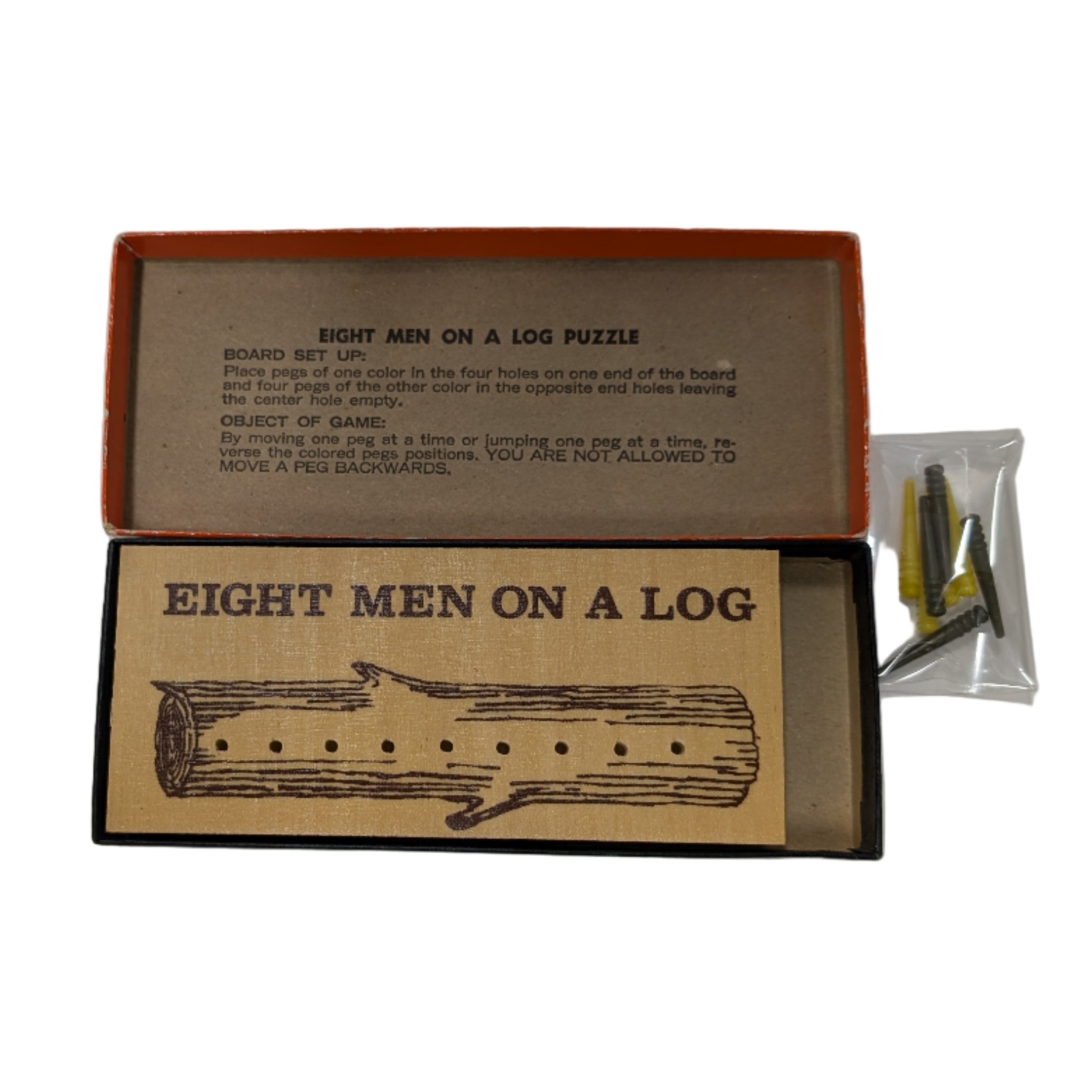 This vintage "Eight Men on a Log" puzzle game is a charming piece of mid-century Americana. Manufactured by Crisloid Plastics Inc. in the USA, this brain teaser challenges players to arrange eight colorful figures on a log using logic and spatial reasoning.