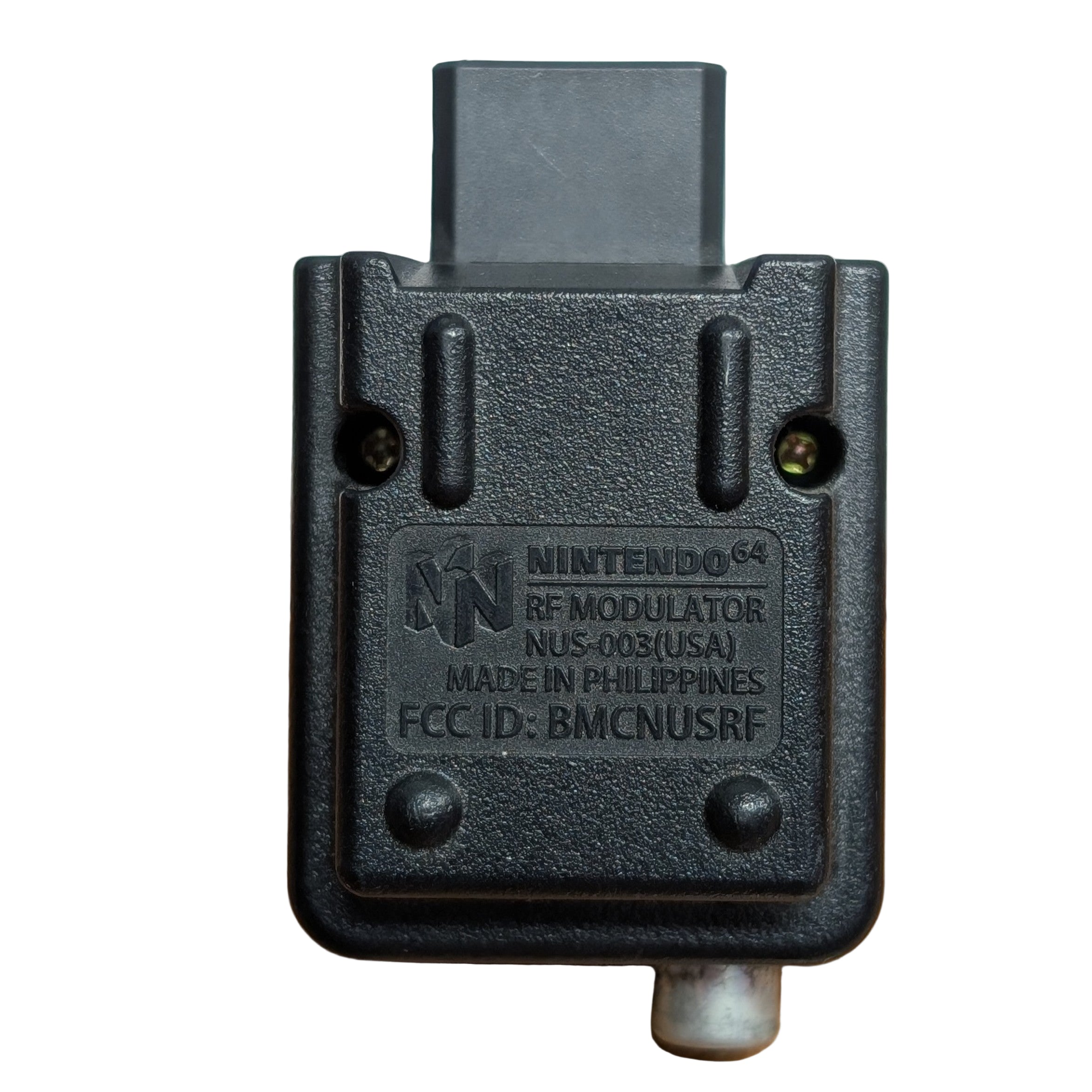 Original Nintendo 64 RF modulator model NUS-003 for USA region. This essential accessory allows you to connect your Nintendo 64 console to older televisions that don't have composite video inputs.