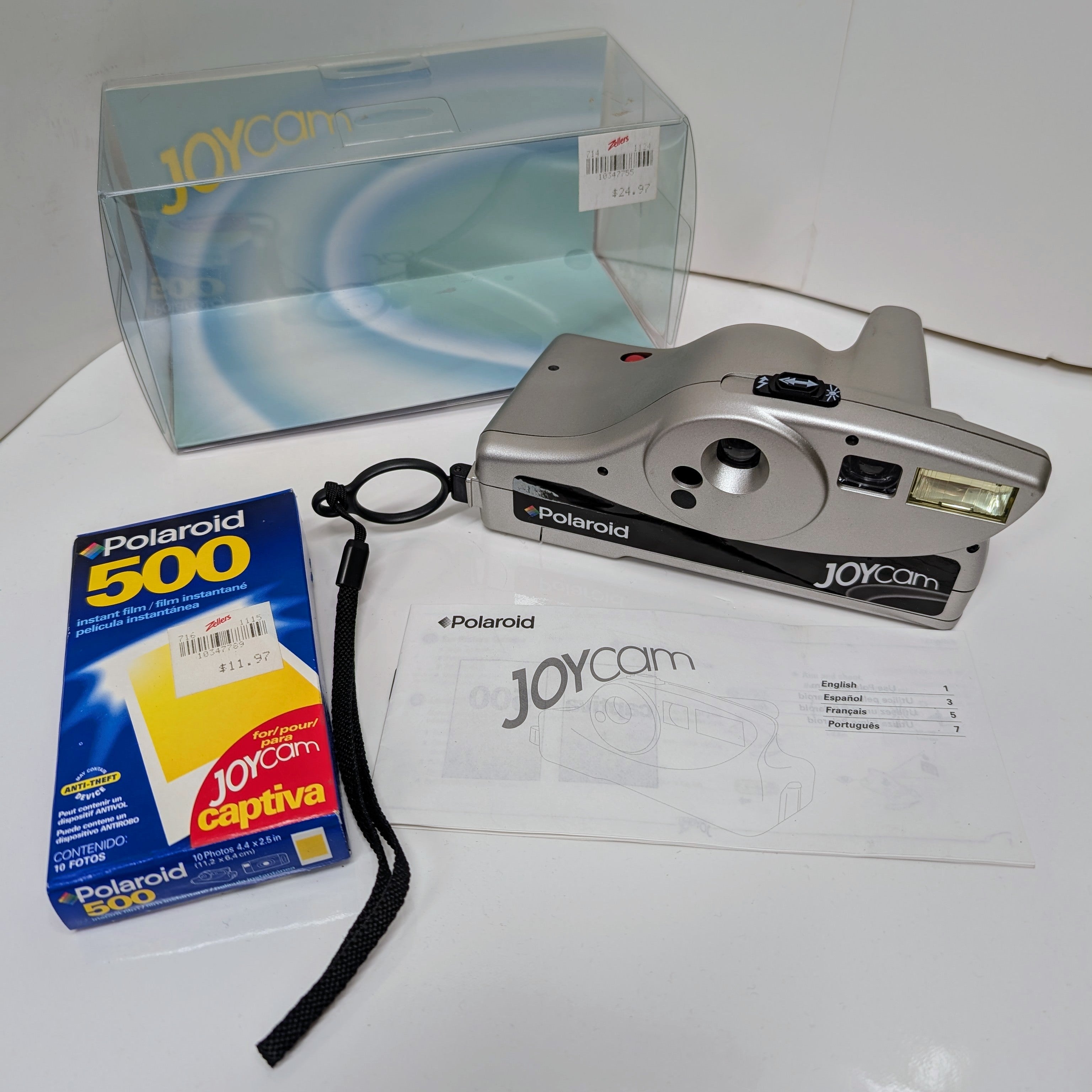 Polaroid 500 instant film box and Joycam camera packaging on a white background