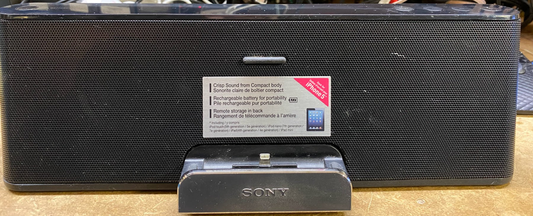 Testé avec iPhone 11-fonctionne bien. Livré avec un adaptateur secteur Sony. A AUX. Télécommande non incluse.