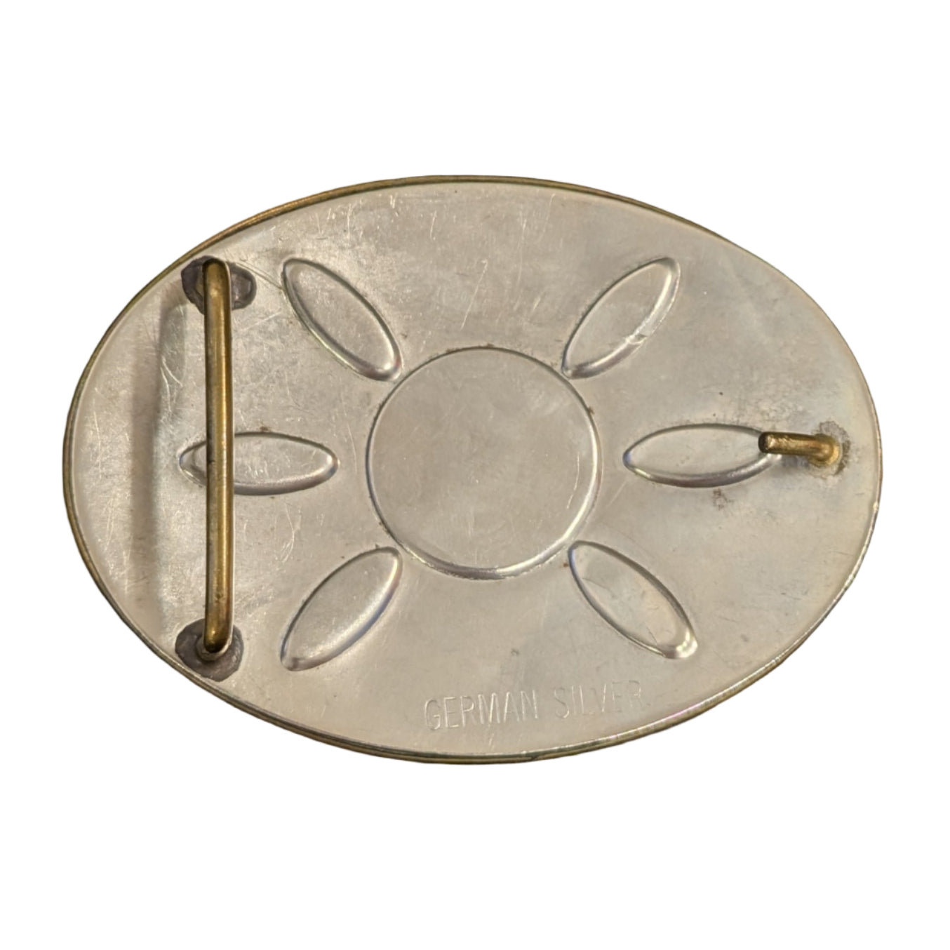Dukes of Hazard Nickel Silver Belt Buckle, stamped "German Silver" on back. Stones show signs of wear: several scratches on surface.