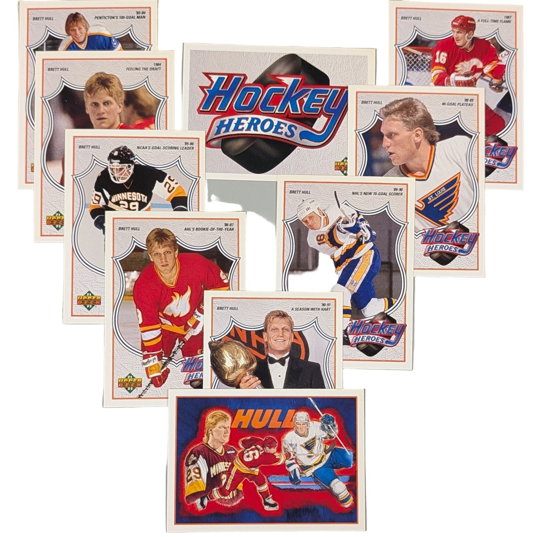 Own the complete 1991 Upper Deck Hockey Heroes Brett Hull subset featuring all 10 cards celebrating 'The Golden Brett' at the peak of his incredible career. This special subset showcases one of the greatest goal scorers in NHL history.