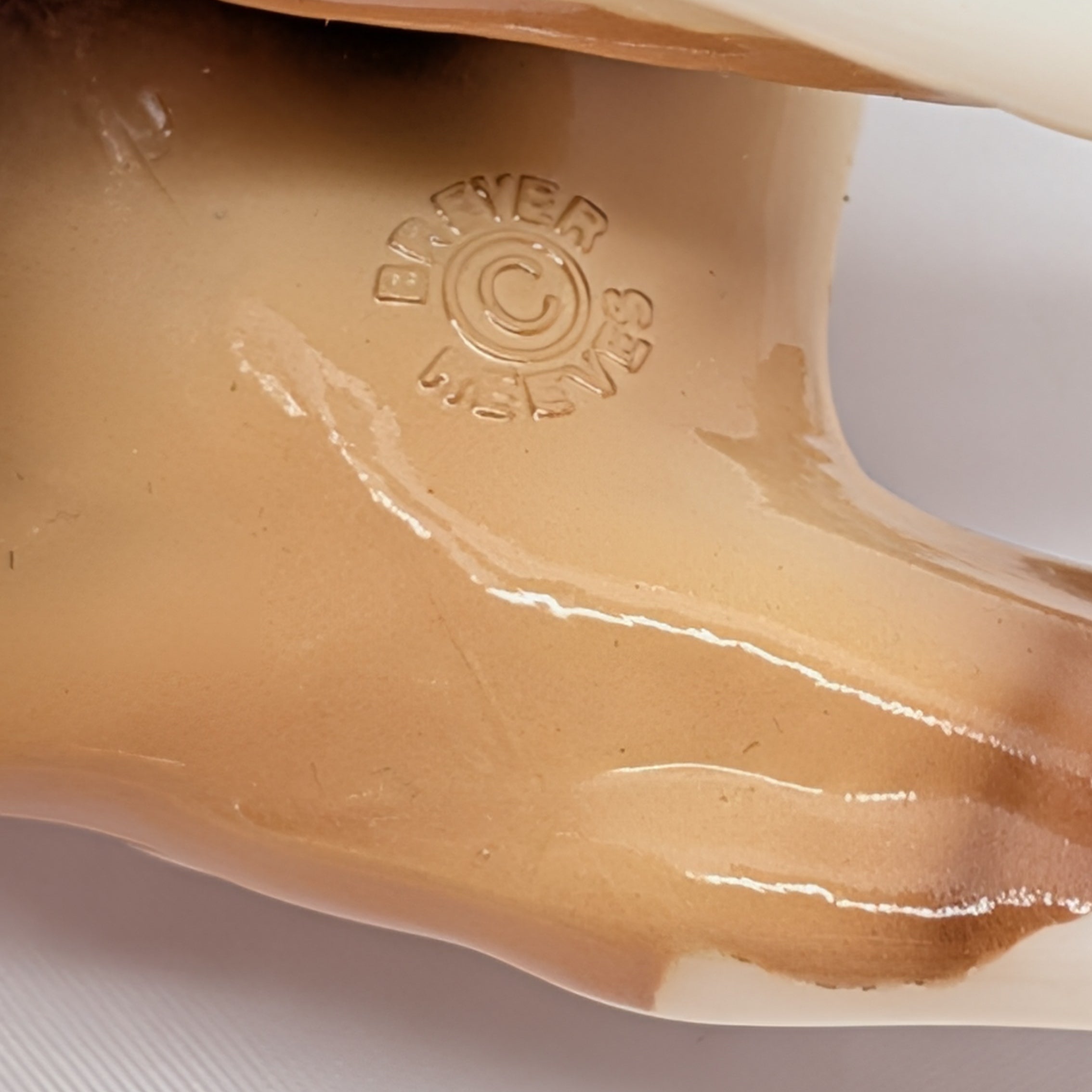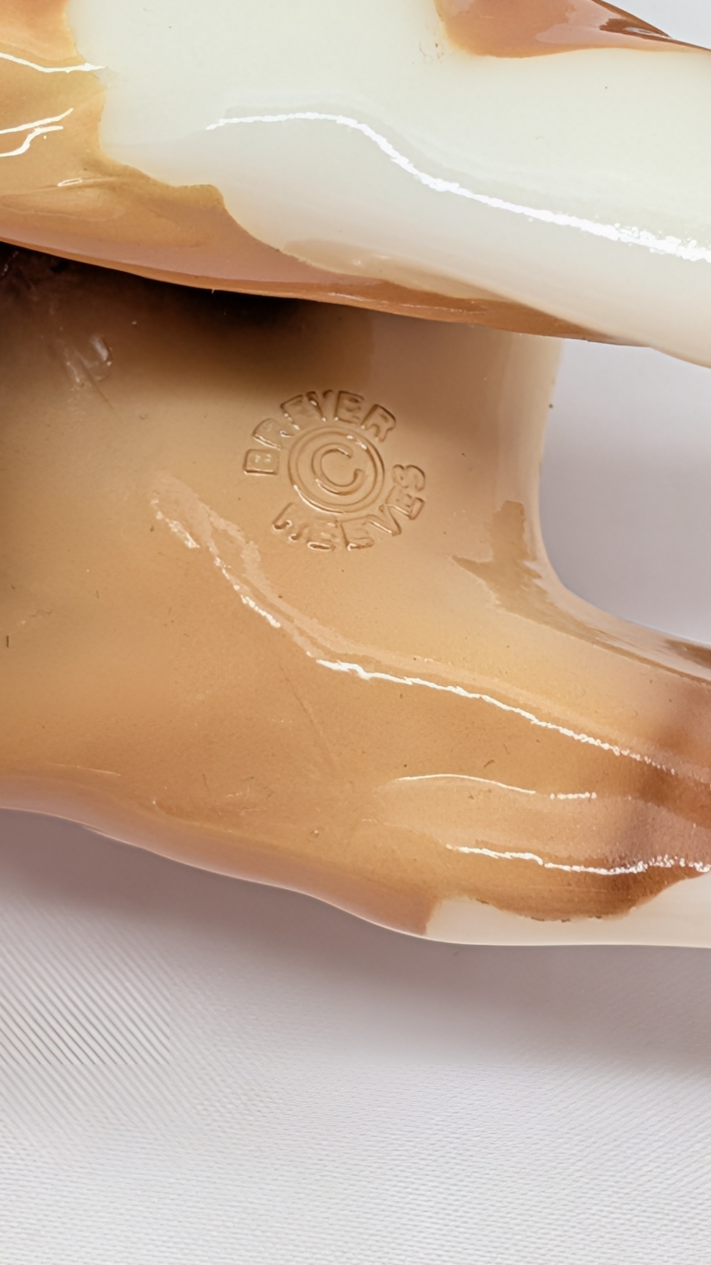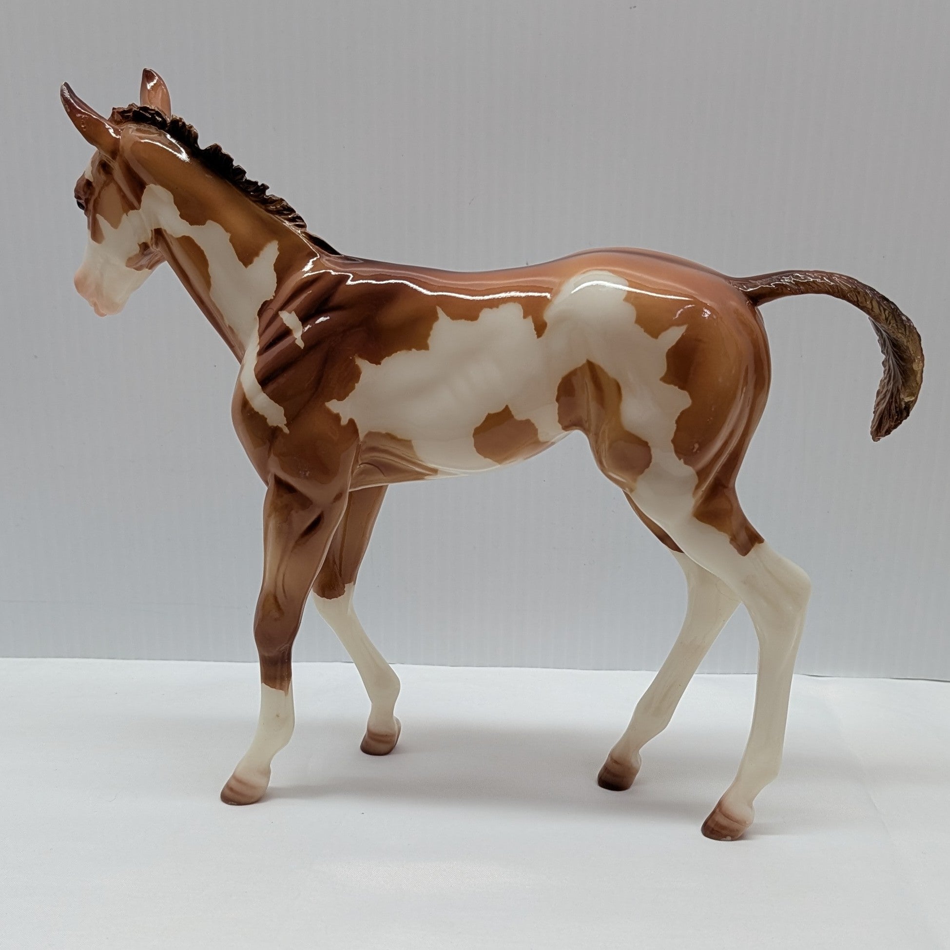 Model horse with brown and white pattern on a white background