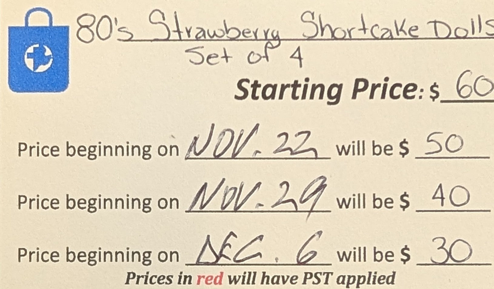 Part of our "Countdown Auction", this item is available for immediate purchase. The price is set to drop every Saturday morning (by 9:30 in store & online); see the picture of the description card for amounts and dates. (Please note, items priced over $100 will have 7% PST applied.)