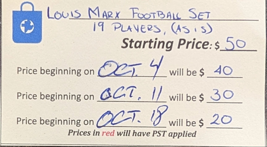 Part of our "Countdown Auction", this item is available for immediate purchase. The price is set to drop every Saturday morning (by 9:30 in store & online); see the picture of the description card for amounts and dates. (Please note, items priced over $100 will have 7% PST applied.)
