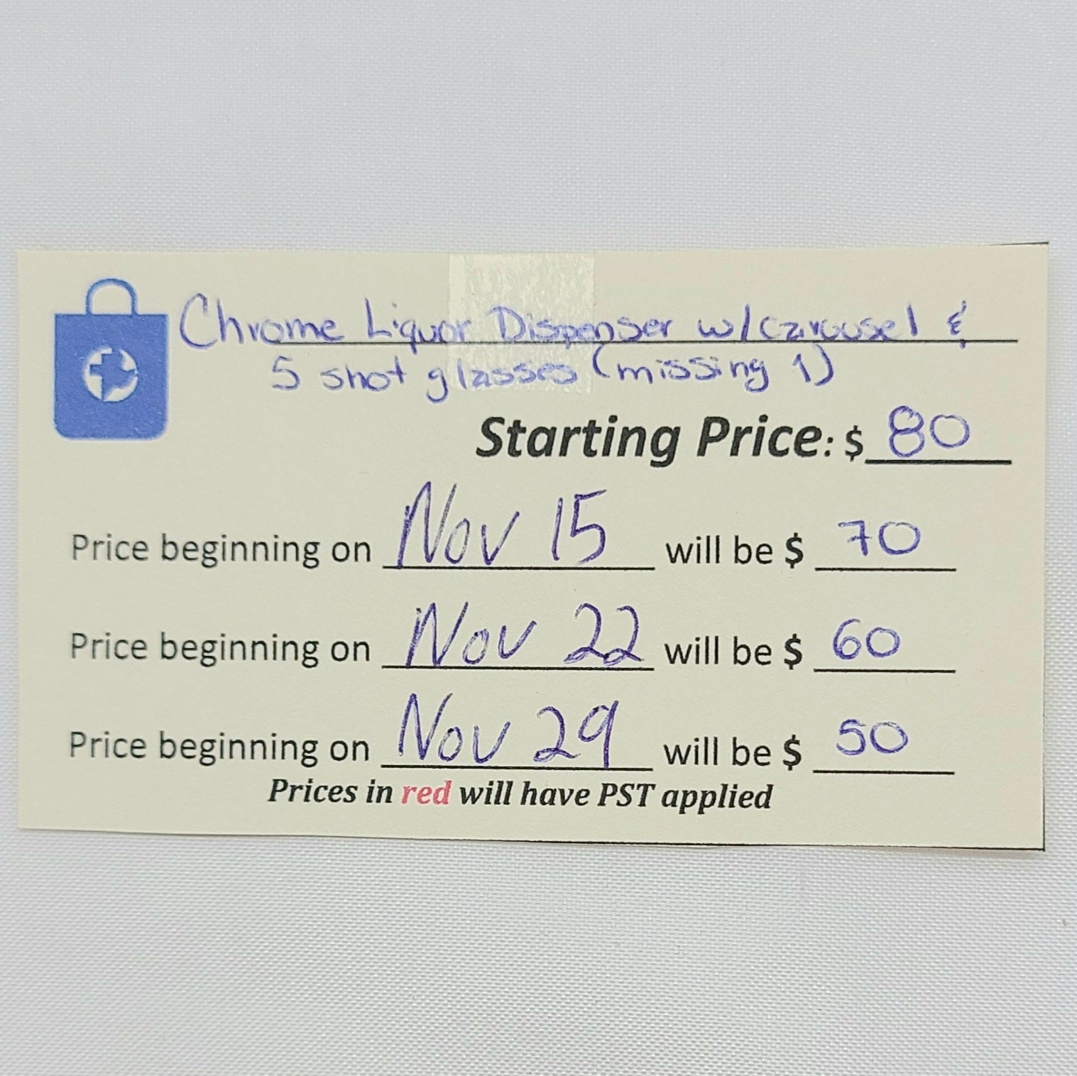 Aceuil/Vente aux enchères avec compte à rebours/Chrome Liquor Dispenser w/ carousel & 5 shot glasses, (Missing 1) [Countdown Auction]