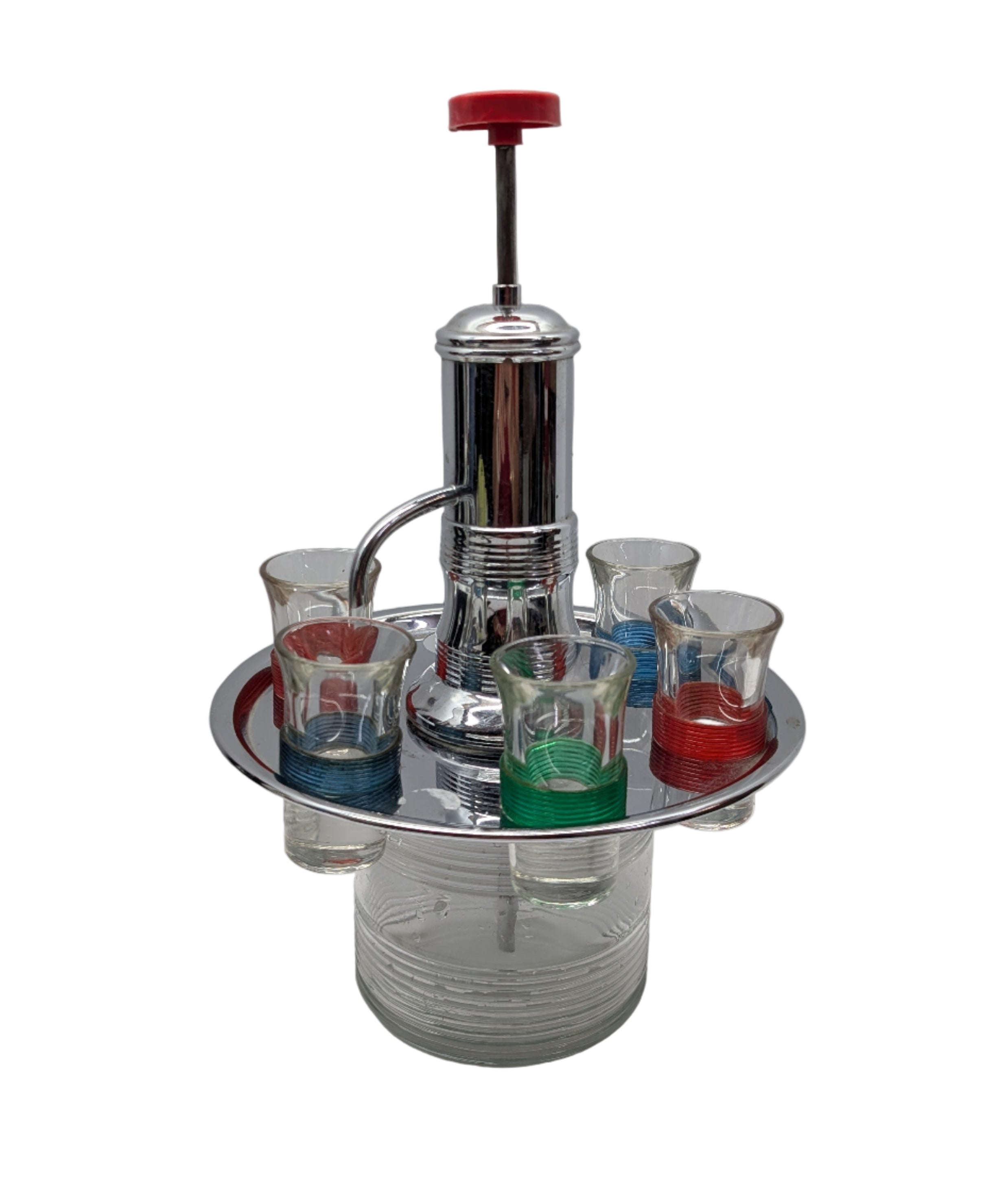 Chrome Liquor Dispenser w/ carousel & 5 shot glasses, (Missing 1) [Countdown Auction]