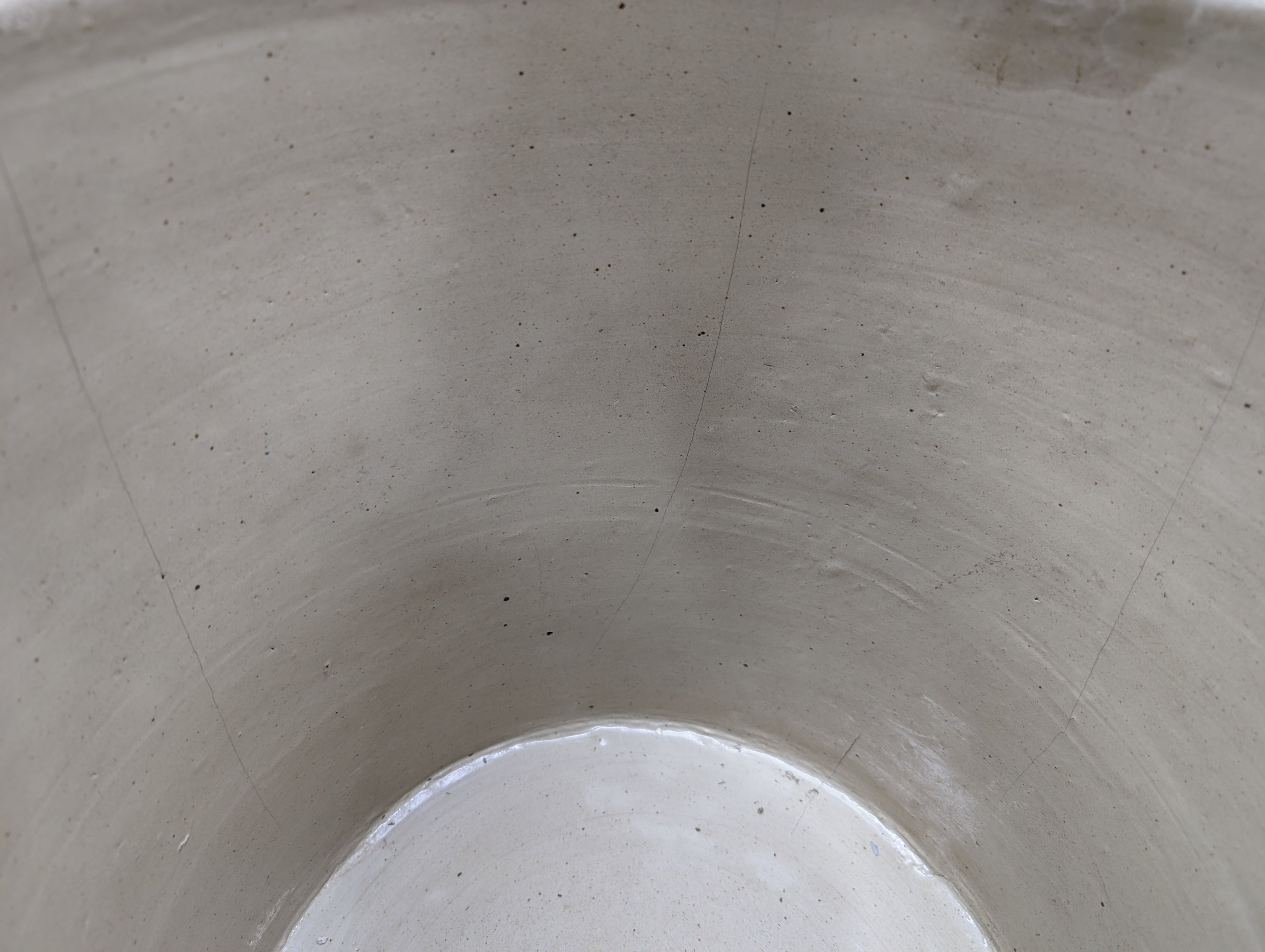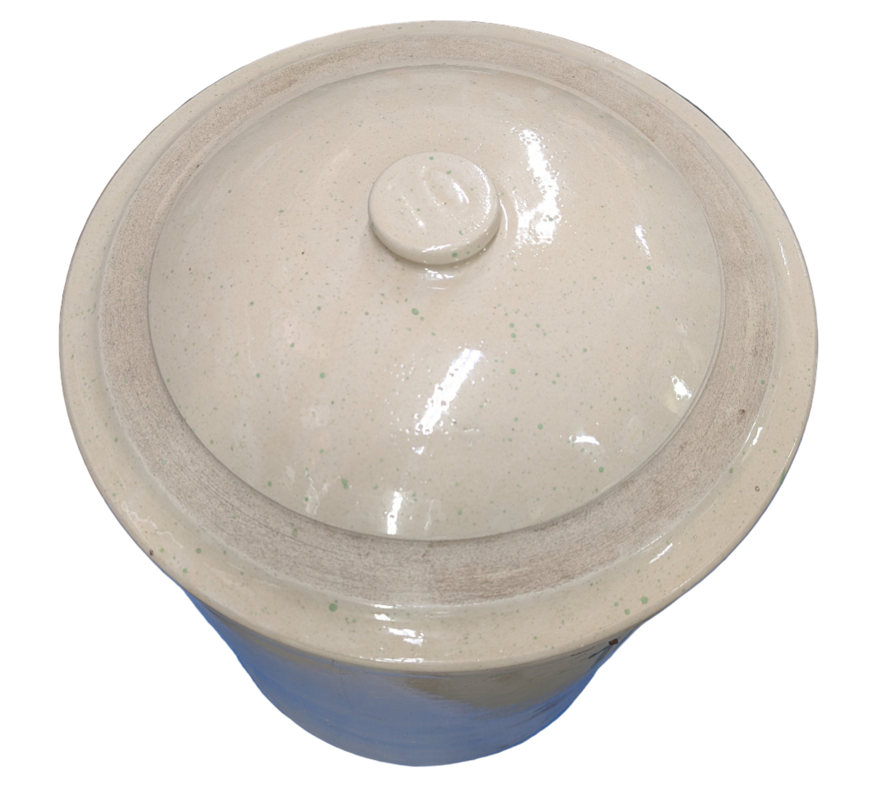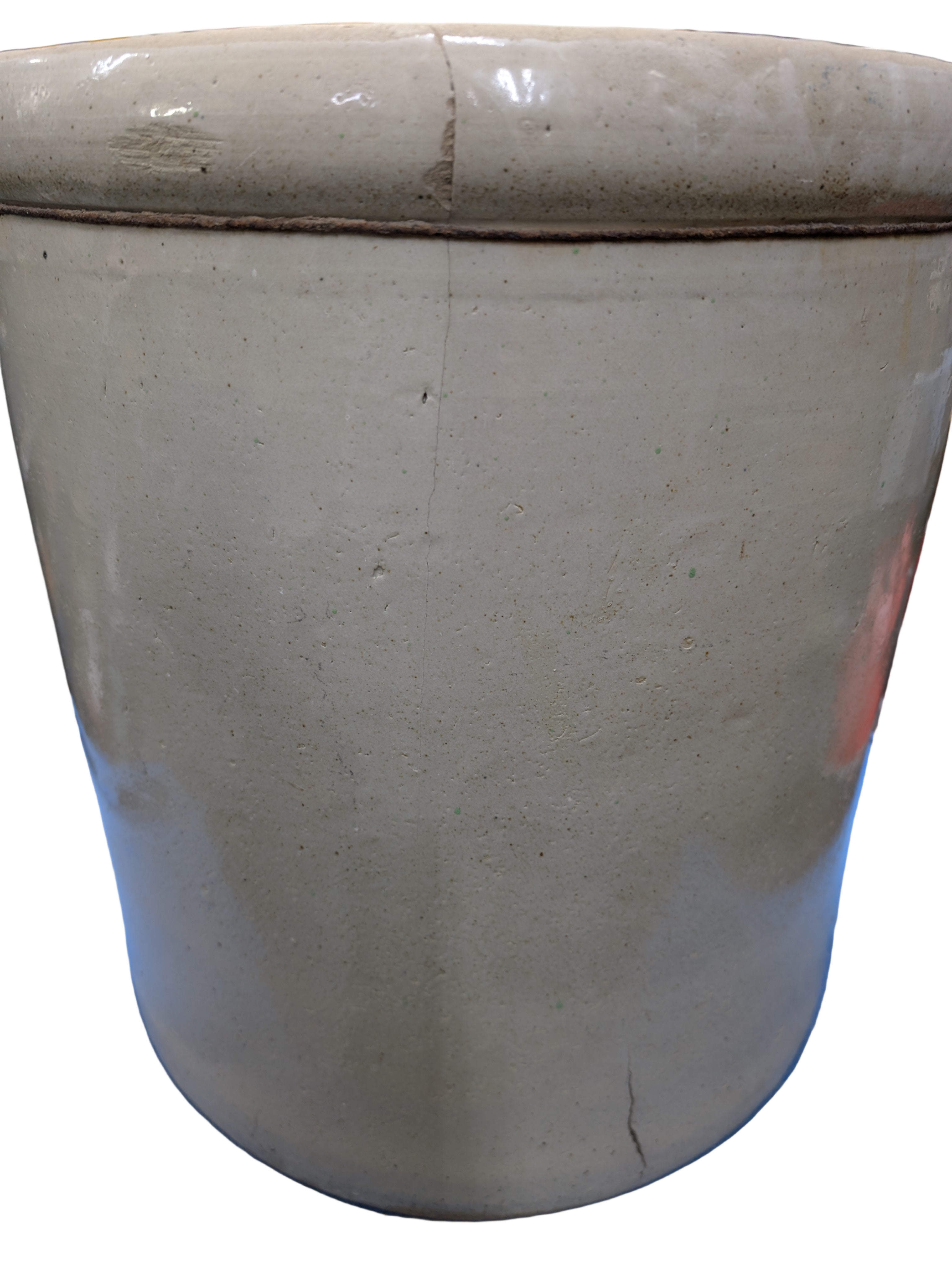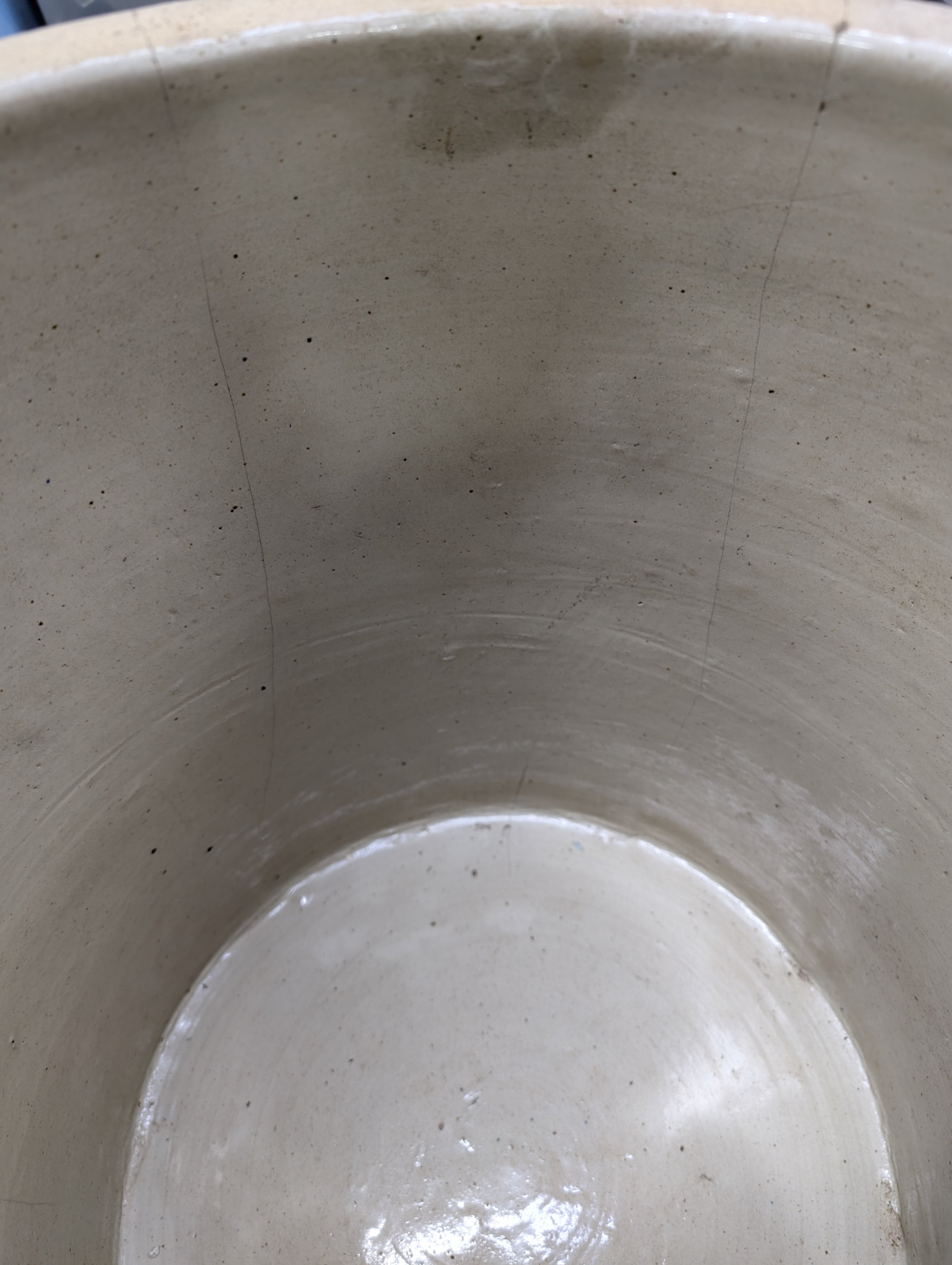 Cracks on it. Lid doesn't fix right is for the 10 gallon crock. Can't ship this item as it is to heavy.