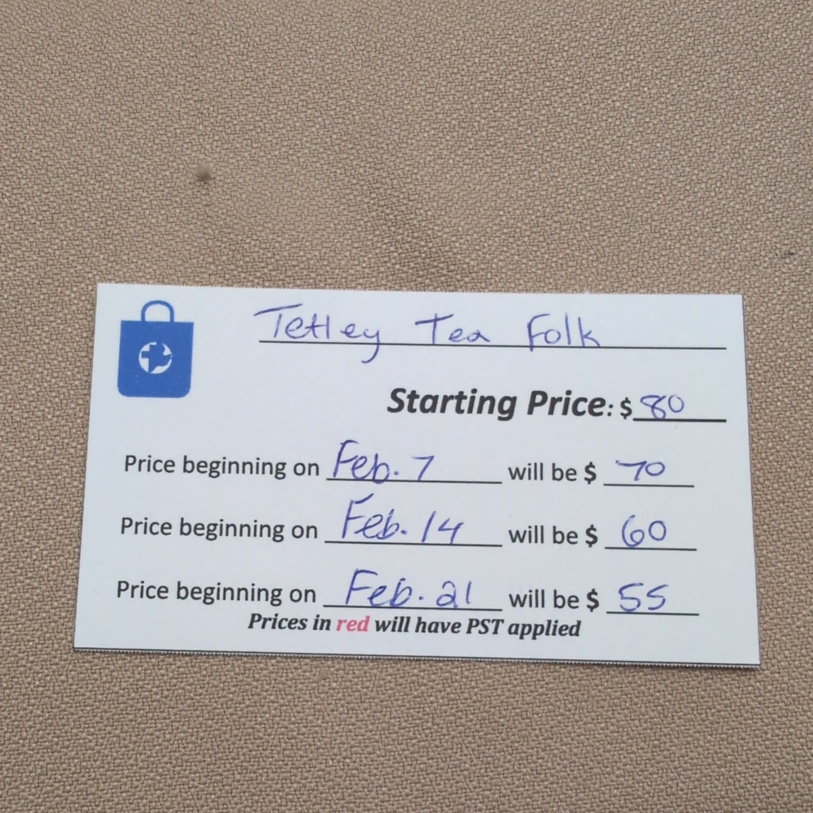 Part of our "Countdown Auction", this item is available for immediate purchase. The price is set to drop every Saturday morning (by 9:30 in store & online); see the picture of the description card for amounts and dates. (Please note, items priced over $100 will have 7% PST applied.)