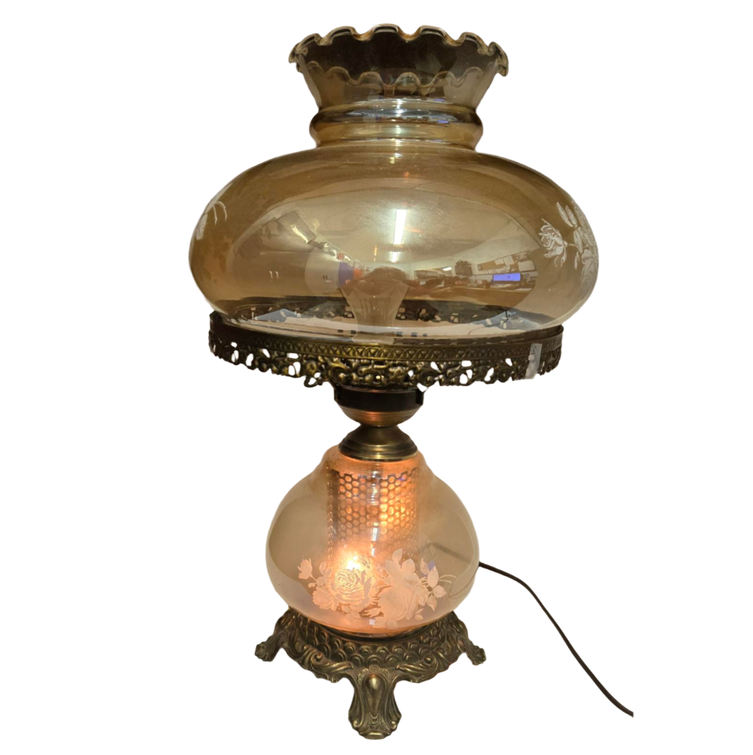 Aceuil/Éclairage/Large Victorian Gone With the Wind Hurricane Amber ruffled Shade Double Globe White Rose Parlor Lamp