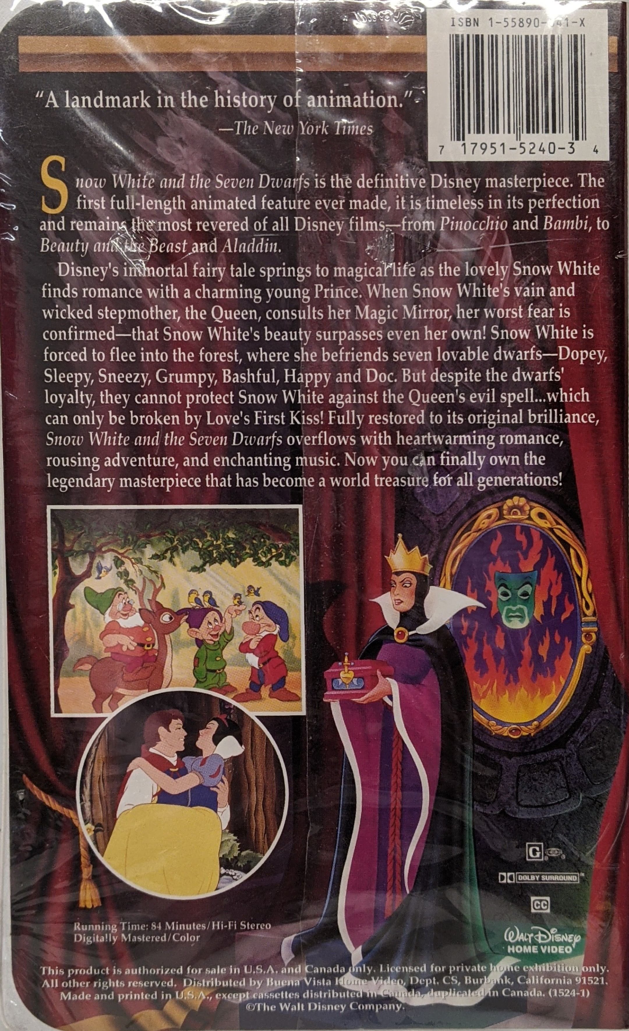 En tant que premier long métrage d'animation Disney jamais sorti en 1937 (et après sa dernière réédition en salles le 2 juillet 1993 lorsque le film a été restauré numériquement), Blanche-Neige et les Sept Nains a été annoncé pour sa première sortie vidéo personnelle à l'automne. le 22 février 1994. C'était aussi le tout premier titre de la Walt Disney Masterpiece Collection. Les premières cassettes ont été imprimées en mai 1994.