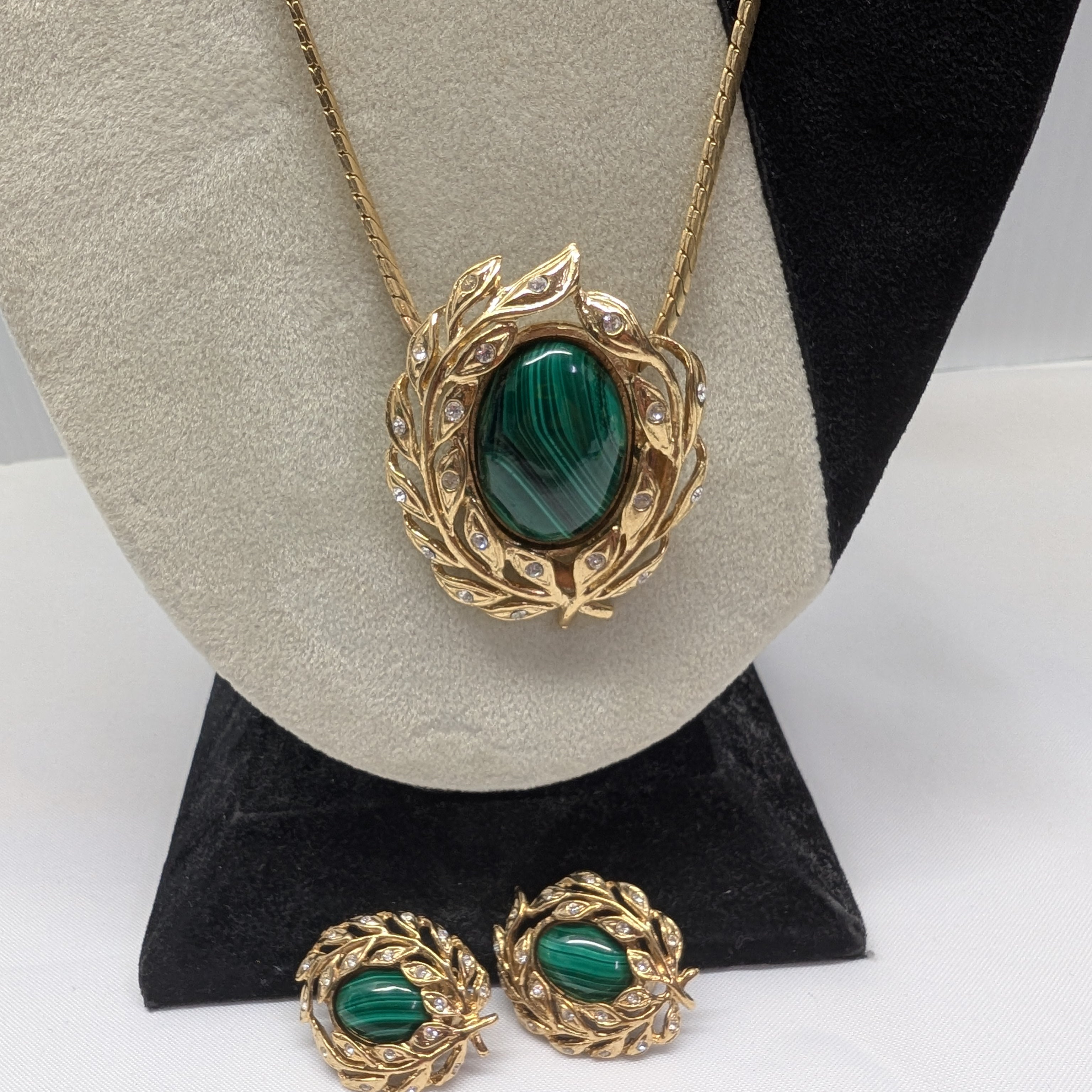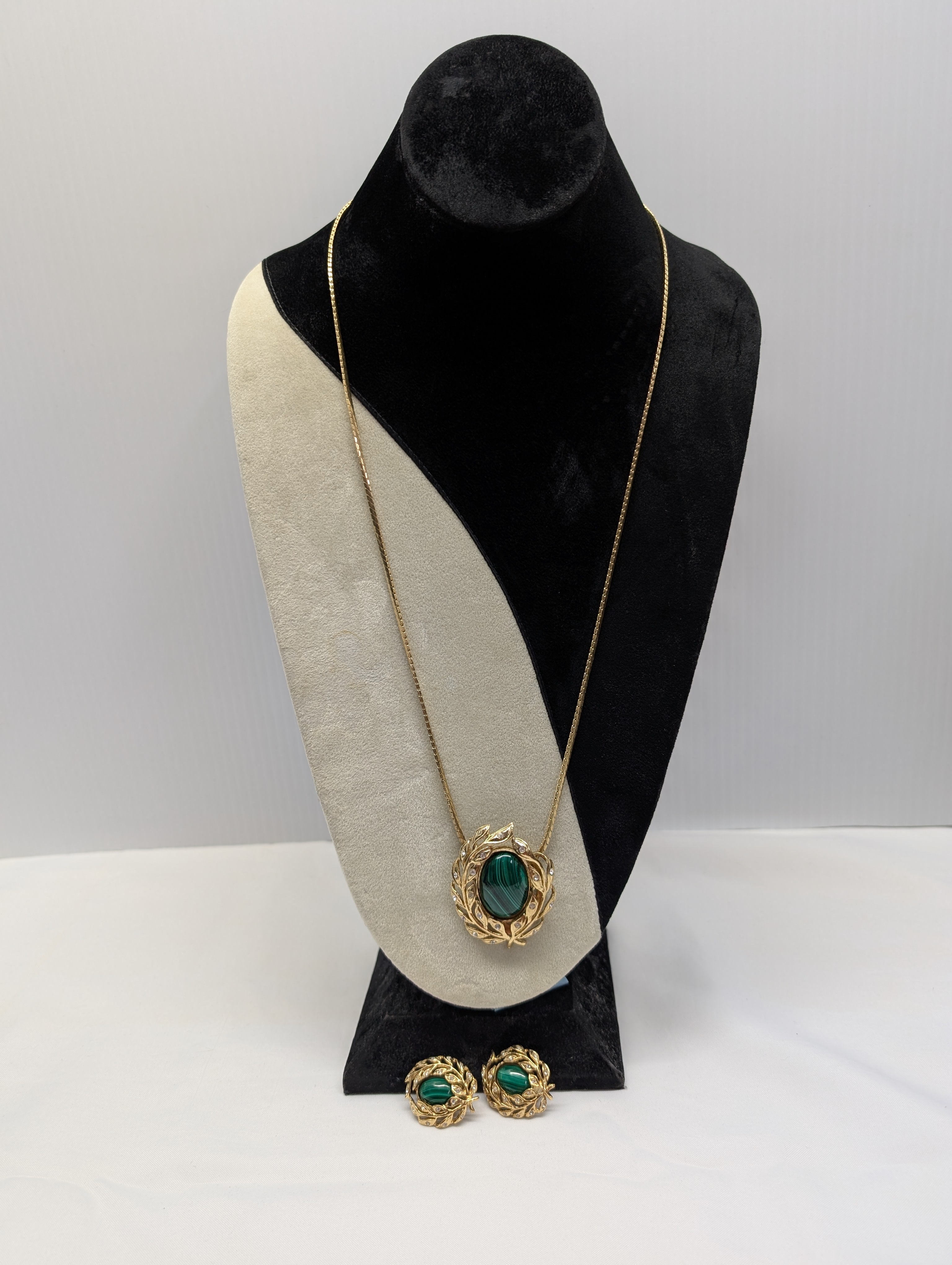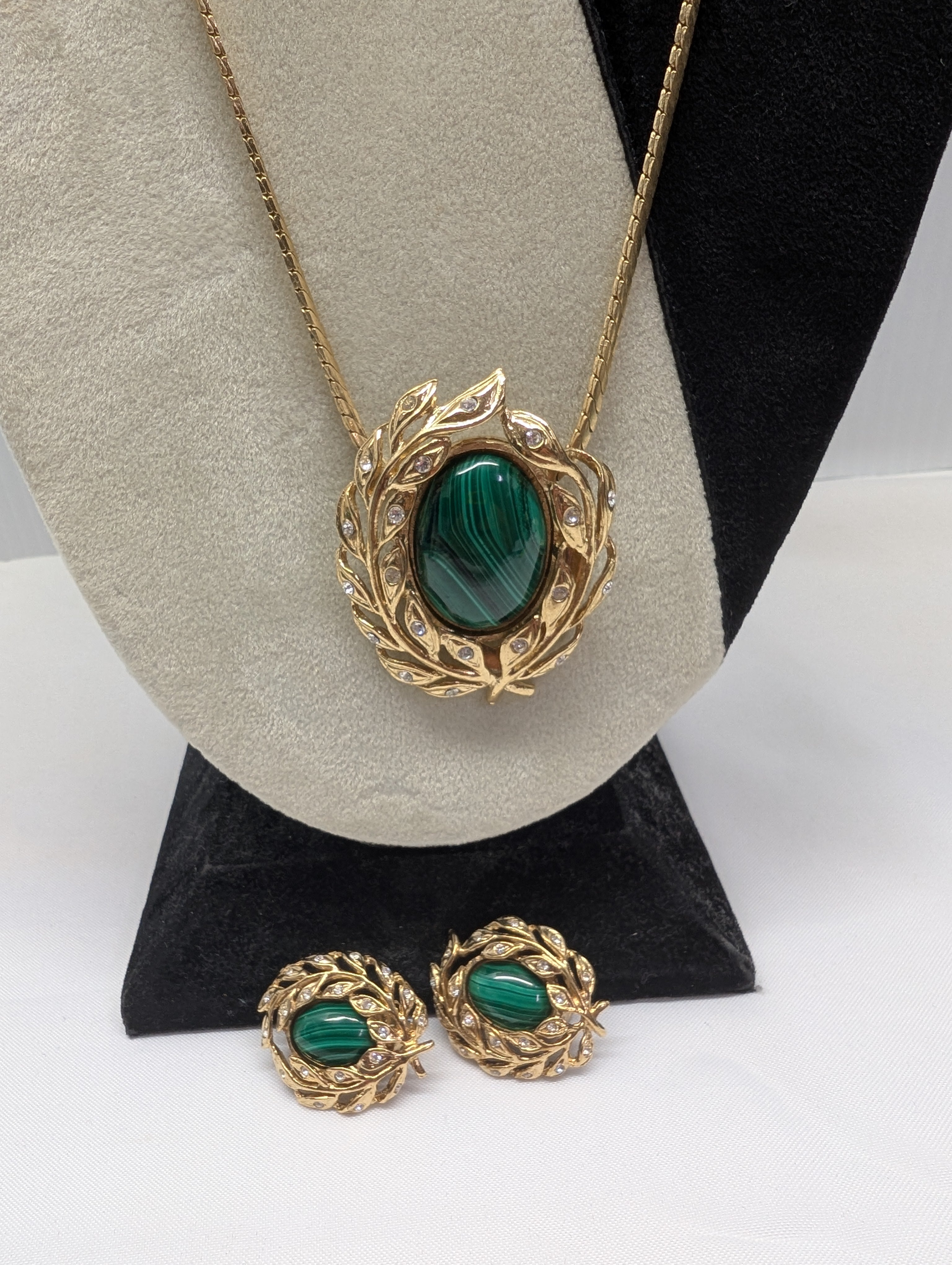 Butler Malachite Clip-ons + Scarf Clip/Necklace, 30". As is. [Countdown Auction]