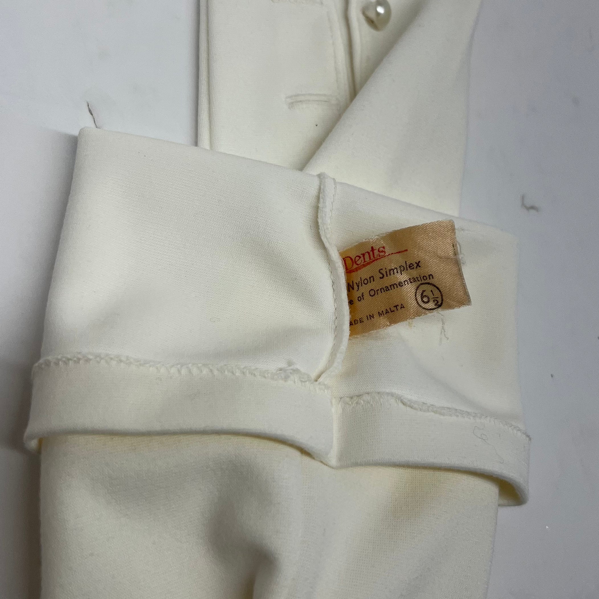 In fair condition, a few stain spots, and one button is loose (as pictured). Made in Malta, from Dents. Size 6 1/2. Measure 21” from fingertip to cuff.